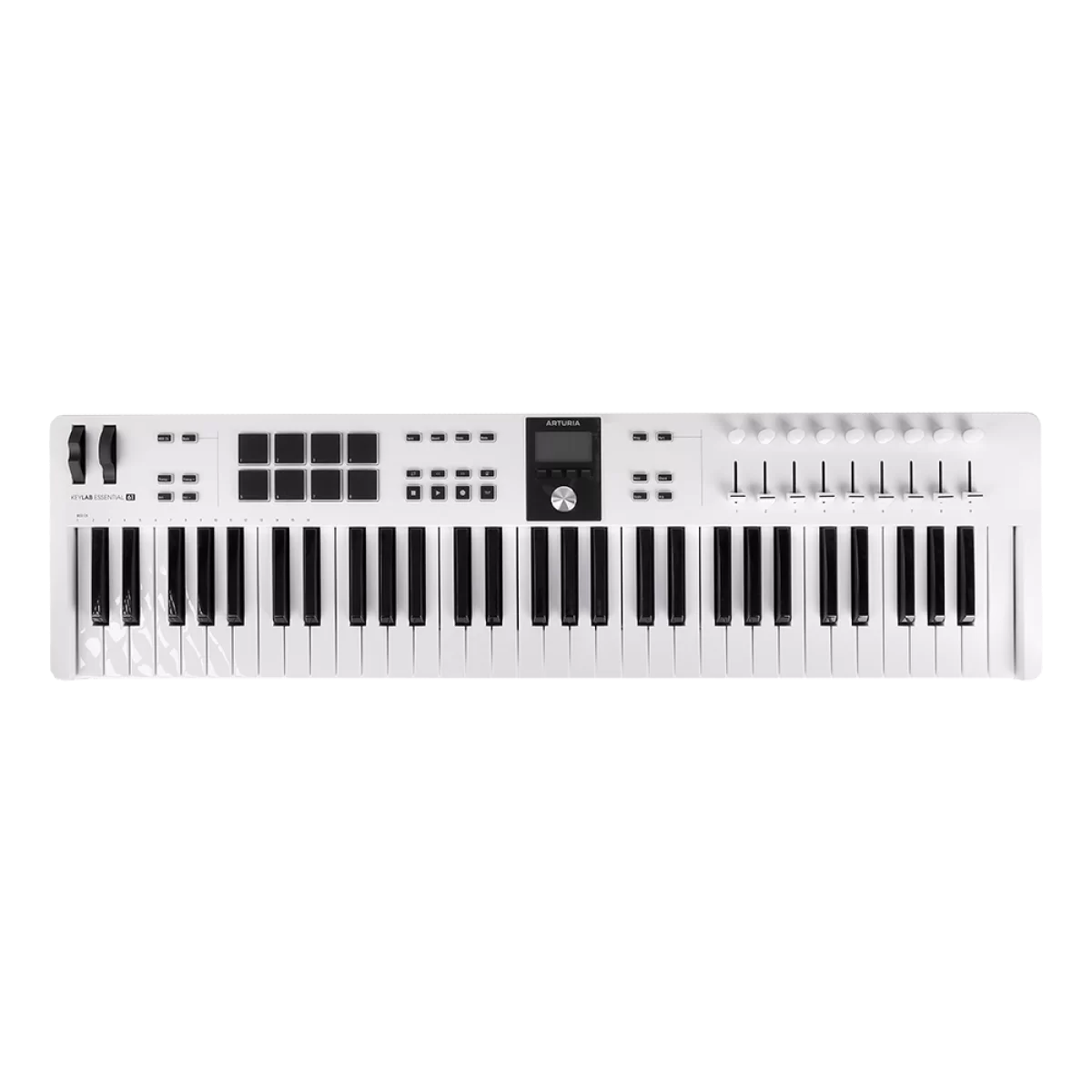 Arturia KeyLab Essential 61 mk3 также является и удобным MIDI-контроллером, третье поколение устройств имеет обновленный дизайн с продвинутым интуитивным управлением. Имеются предварительные настройки для Ableton Live, Logic Pro, FL Studio, Cubase, Bitwig Studio, а также широкая совместимость с протоколами MCU и HUI. По центру контроллера имеется крупный информативный дисплей 2,5" с четырьмя кнопками управления параметров навигации. Встроенный арпеджиатор позволяет переключаться между режимами - Scale, Chord Play, Arpeggiator (с пресетами) и Hold.