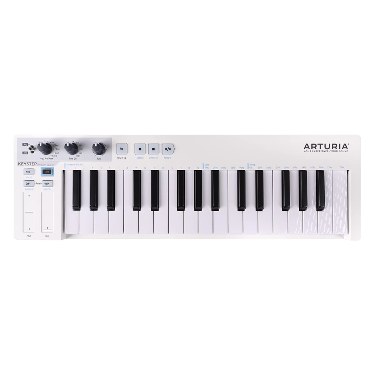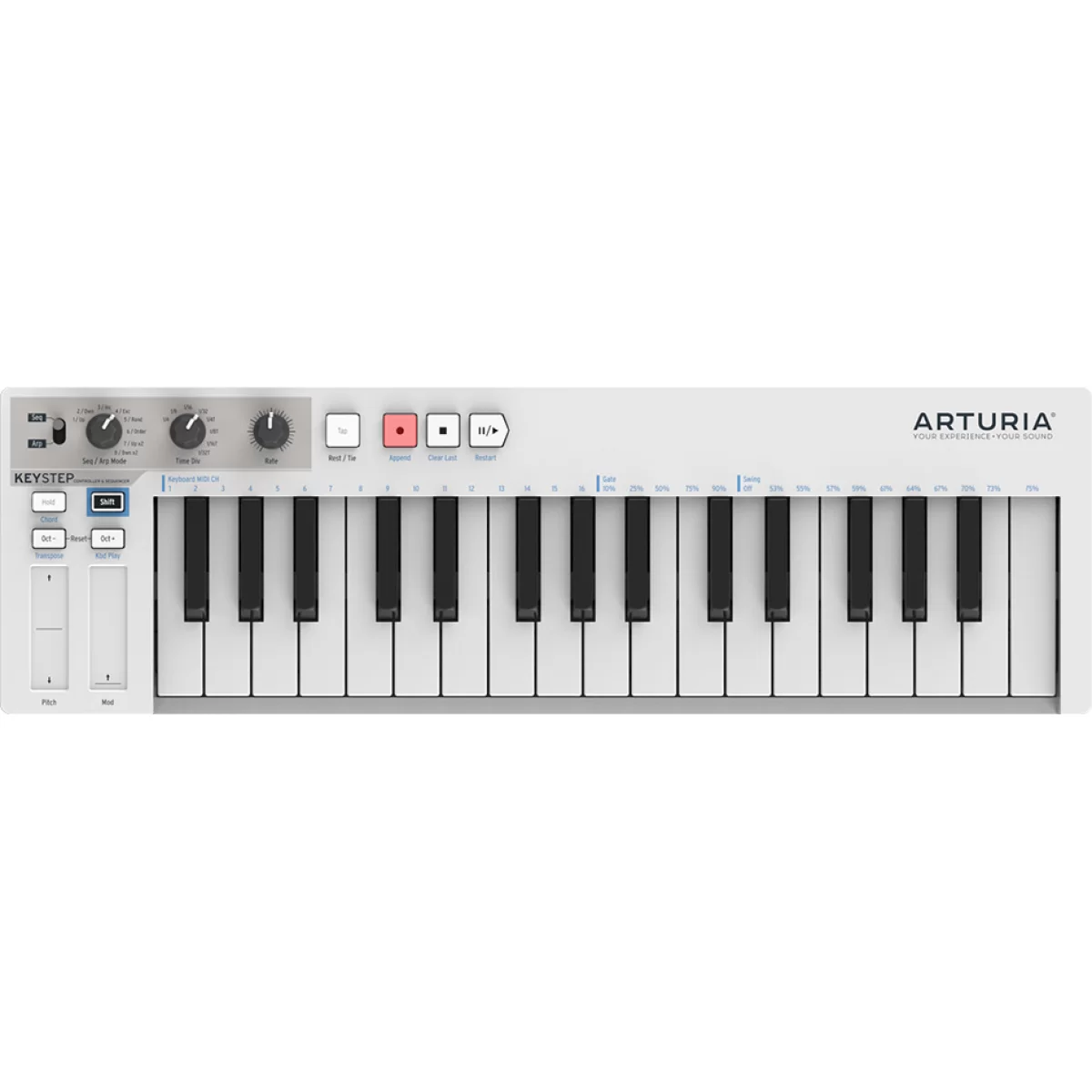 Описание подготовлено командой сайта samid.ruДля исполнения мелодических партий здесь присутствует уменьшенная клавиатура с 32 клавишами, оборудованными чувствительностью к силе нажатия и функцией послекасания (Aftertouch). Такой тип клавиатуры обеспечивает превосходную динамику и артикуляцию во время игры и, несмотря на малый размер самих клавиш и их небольшое количество, подходит даже для игры сложных фортепианных композиций. Среди достоинств данной модели также выделяются встроенные секвенсер и арпеджиатор, которые переключаются специальным тумблером, имеют по восемь режимов и ритмических рисунков каждый, а также оборудованы регуляторами темпа и длительности нот. Первый параметр может быть выбран в диапазоне от 30 до 240 ударов в минуту, а размер нот позволяется выбрать от 1/4 до 1/32 триоли. Для установки темпа также есть функция Tap Tempo. Среди прочих органов управления в наличии имеются кнопки переключения октав, включения и остановки записи и воспроизведения, а также две сенсорных полосы, отвечающие за высоту тона и глубину модуляции. Клавиатура способна функционировать в режиме Chord, позволяющем зажатием лишь одной клавиши исполнить целый аккорд, а с помощью кнопки Shift можно устанавливать параметры таких функций как Swing и Gate для арпеджиатора или секвенсера.