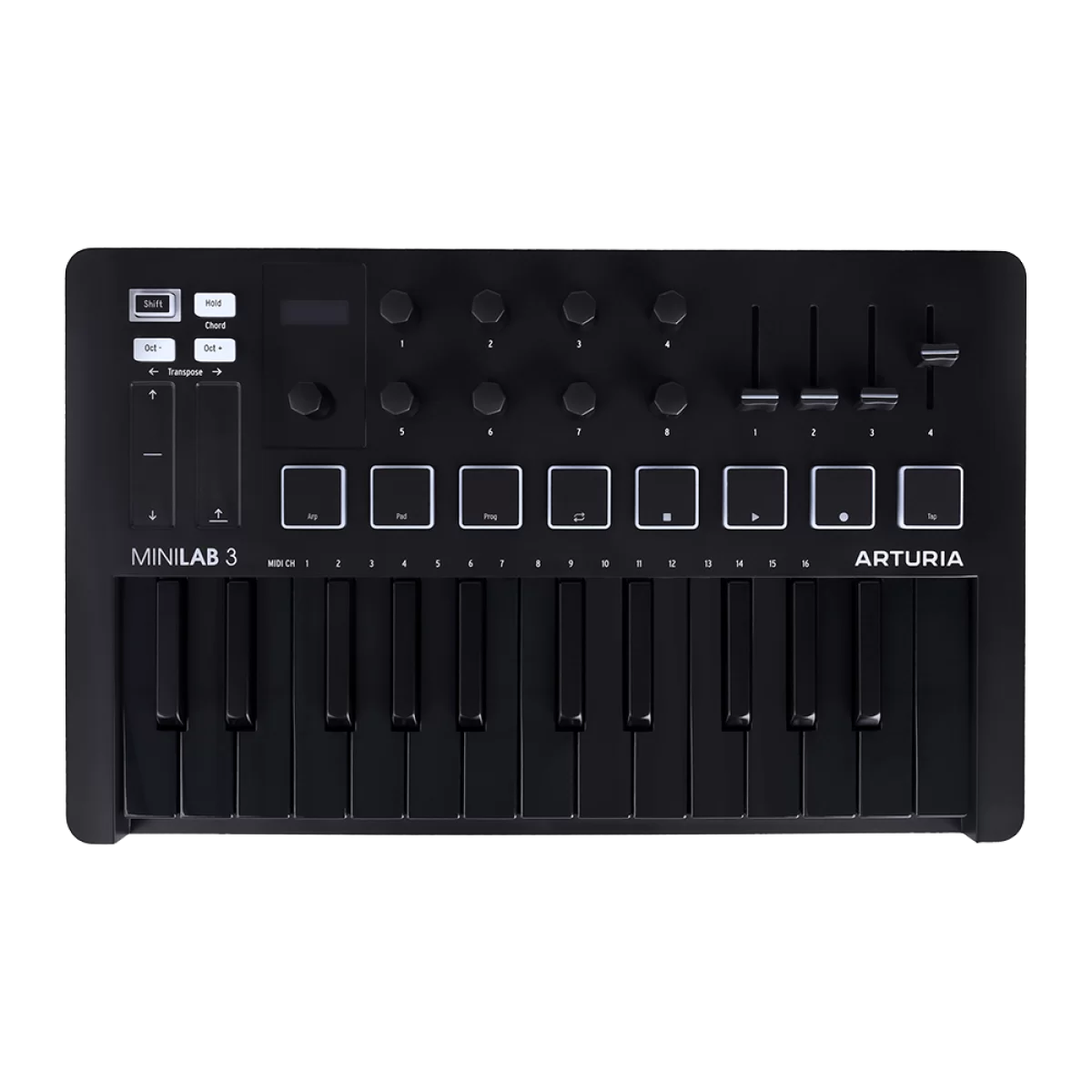 Arturia MiniLab 3 Deep Black — компактная MIDI-клавиатура на 25 мини-клавиш и восемь пэдов с RGB-подсветкой.