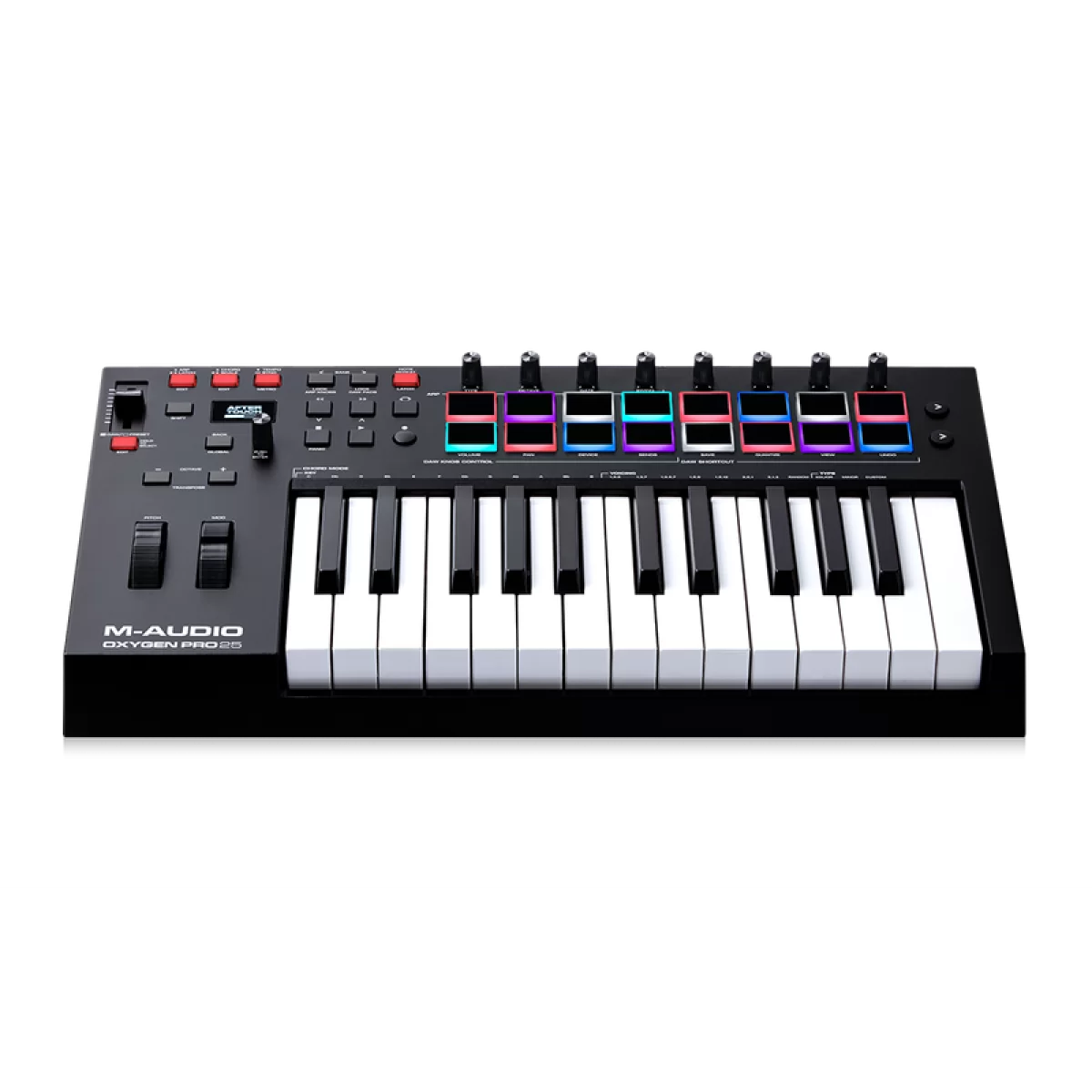 Устройство имеет лучшую в своем классе, чувствительную к скорости нажатия, полувзвешенную клавиатуру с 25 клавишами с послекасанием и назначаемыми зонами. Также контроллер снабжен продвинутым арпеджиатором и имеет 16 назначаемых чувствительных к скорости нажатия пэдов с RGB-подсветкой с функцией Note Repeat и 8 назначаемых регуляторов и кнопок. Благодаря OLED-экрану, настройка Oxygen Pro 25 с любой известной DAW не может быть проще.