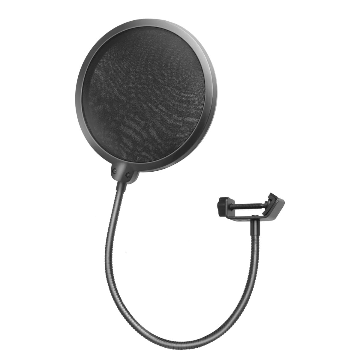 Применяется на студии для защиты записи от нежелательных призвуков, в том числе хорошо сглаживает взрывные звуки, а также защищает мембрану студийного микрофона от внешних воздействий и загрязнений. Поп-фильтр выполнен из звукопрозрачного нейлона и оснащен держателем типа "гусиная шея". Крепится на стойку при помощи струбцины.