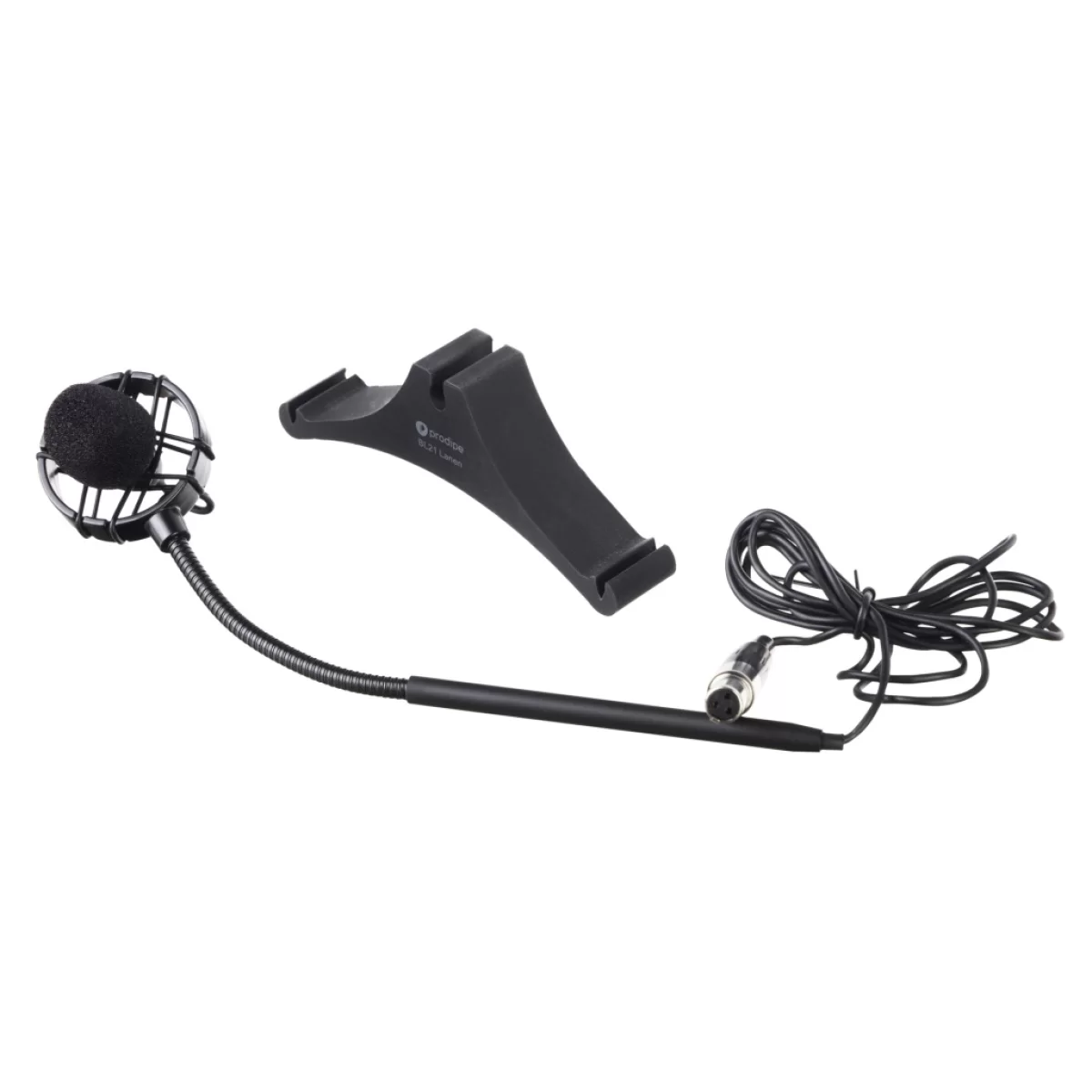 Зажим и переходник XLR поставляются для проводного микрофона (требуется фантомное питание 48 В). Микрофон также можно преобразовать в УВЧ-микрофон, подключив его к системам Prodipe UHF B210 SOLO или UHF B210 DUO (специально адаптированным для импеданса капсюля Lanen 21).
