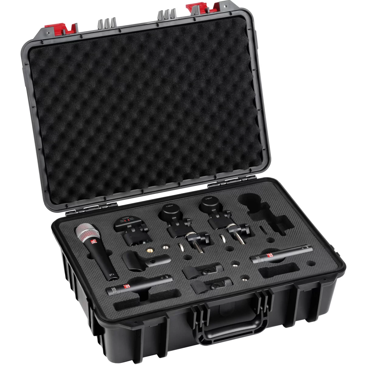 V PACK CLUB состоит из одного микрофона V KICK, двух микрофонов V BEAT и трех креплений V CLAMP, одного микрофона V7 X и пары конденсаторных микрофонов sE7 для оверхэдов. Все микрофоны и входящие в комплект аксессуары надежно упакованы внутри прочного пластикового флайт кейса, в котором предусмотрено пустое пространство для вашего любимого хай-хэт микрофона.