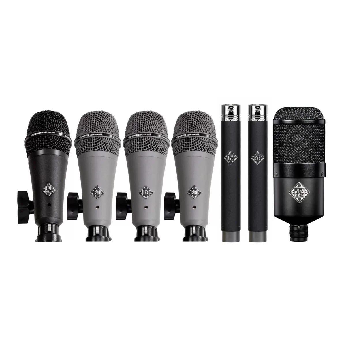 Telefunken объединили четыре уникальных голоса — M80-SHB, M81-SH, M82 и M60, создав комплекты динамических микрофонов для подзвучки барабанов DD6 и DD7. M82 предназначен для бас-бочки, M81-SH — для томов, а для подзвучки малого барабана лучше всего подходит M80-SHB. M60 FET, представляющий собой первый в линейке микрофонов Telefunken Elektroakustik твердотельный безламповый конденсаторный микрофон на основе полевых транзисторов FET (Field Effect Transistor). Универсальность и высочайшее качество звука, удостоенное награды TEC Award, позволяют использовать эти комплекты микрофонов как на живых концертах, так и в студиях звукозаписи.