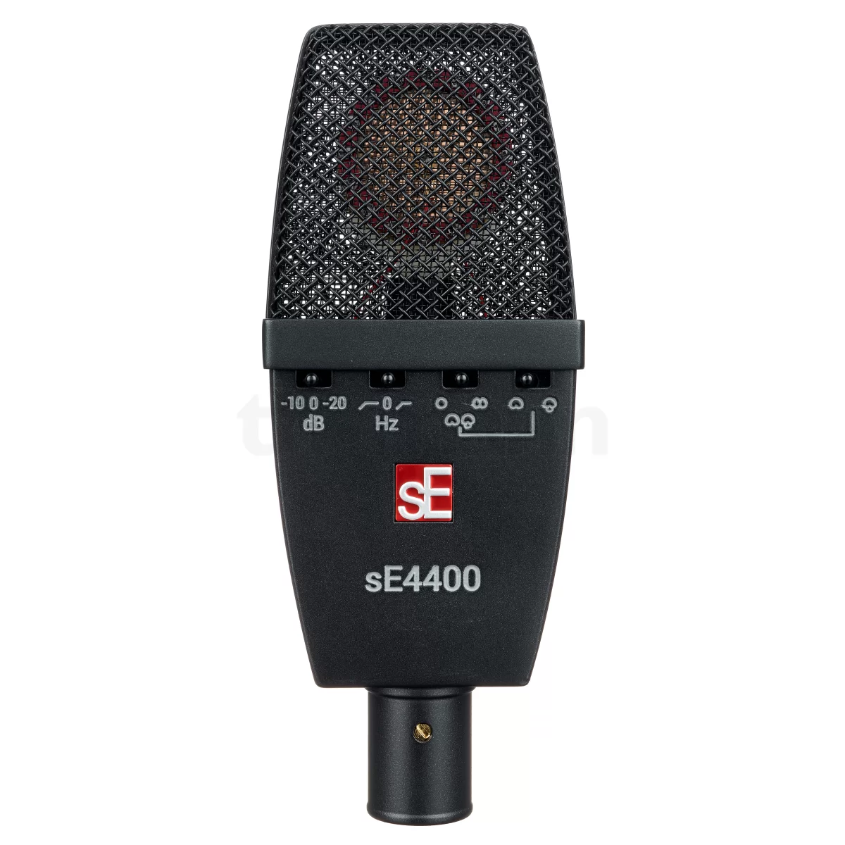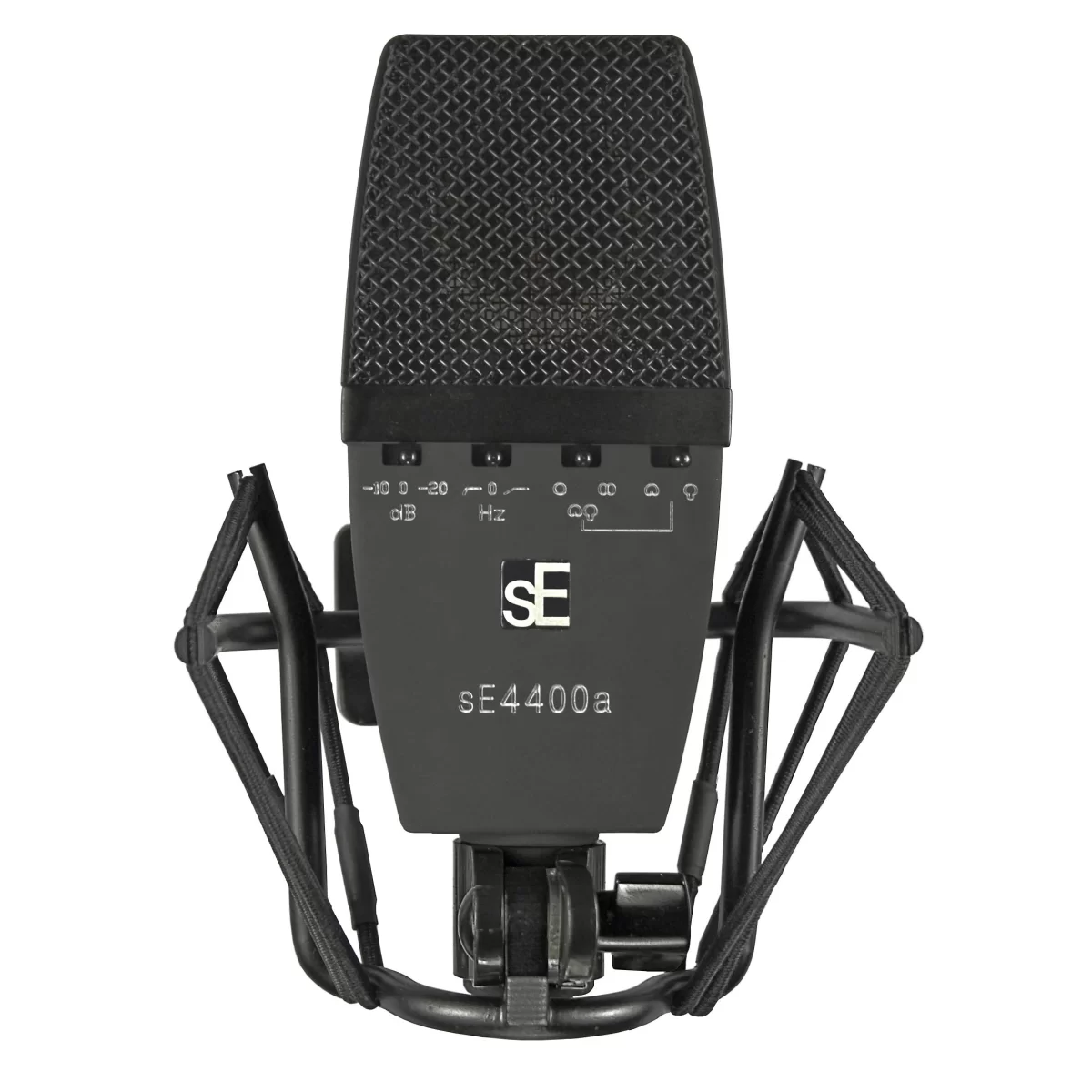 sE4400a имеет 4 диаграммы направленности: кардиоиду, гиперкардиоиду, восьмерку и всенаправленную. Два бас сокращения 60Hz и 120Hz, две подушки-переключателя на 10dB и 20dB. корпус очень маленький, но способен разместить капсулу с двойной диафрагмой 1" и всю высшего класса электронику и переключатели. Этот плоский с закругленными краями корпус разработан принимая во внимание использование микрофона на барабанах или гитарных комбиках, а также безупречен для вокала. Чрезвычайно тонкий менее 3/4", он искусно прилегает к ладони руки. sE4400a имеет уникальное, черное, не отражающее, прорезиненное покрытие, которое идеально для живых концертов, театров, TV и радиовещательного применения, где требуется освещение. Он жизненно важен в профессиональных студиях, где звукорежиссерам необходимо знать досягаемость к микрофону, которое удобно для любой работы и одновременно пользователям домашних студий, которые стеснены в средствах и им нужен один микрофон на все подходящие случаи. Уникальный держатель позволяет устанавливать микрофон даже в крошечном пространстве или повернув зажим, устанавливать микрофон полностью в стороне от держателя для вокала. Микрофон поставляется в черном алюминиевом переносном кейсе.