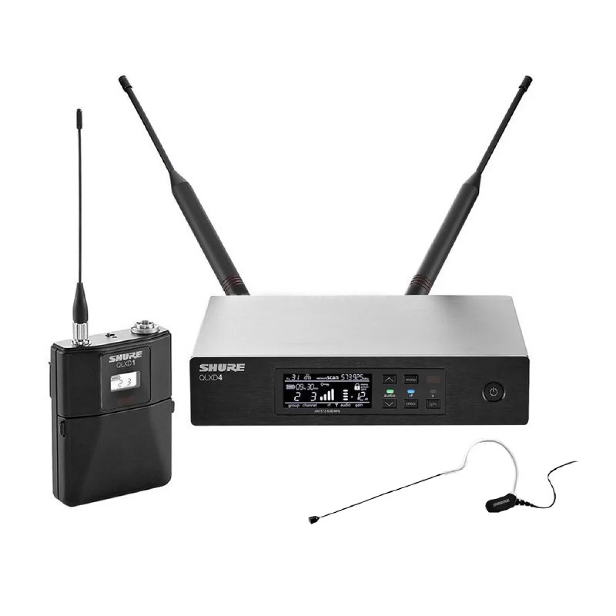 ShureShure QLXD14/153B - Беспроводная микрофонная система содержит передатчик QLXD1, головной микрофон MX153B и приемник QLXD4.