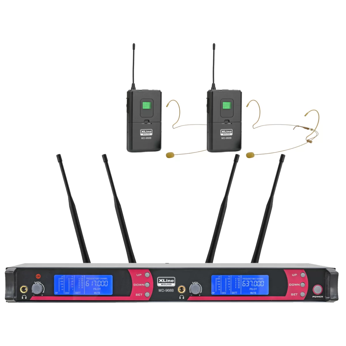 Xline MD-968B - Радиосистема двухканальная c двумя поясными передатчиками, 2 канала по 100 фиксированных частот, подстройка частот с помощью IR-порта, рабочая дистанция до 300 м, диапазон несущей частоты 650-700 МГц.