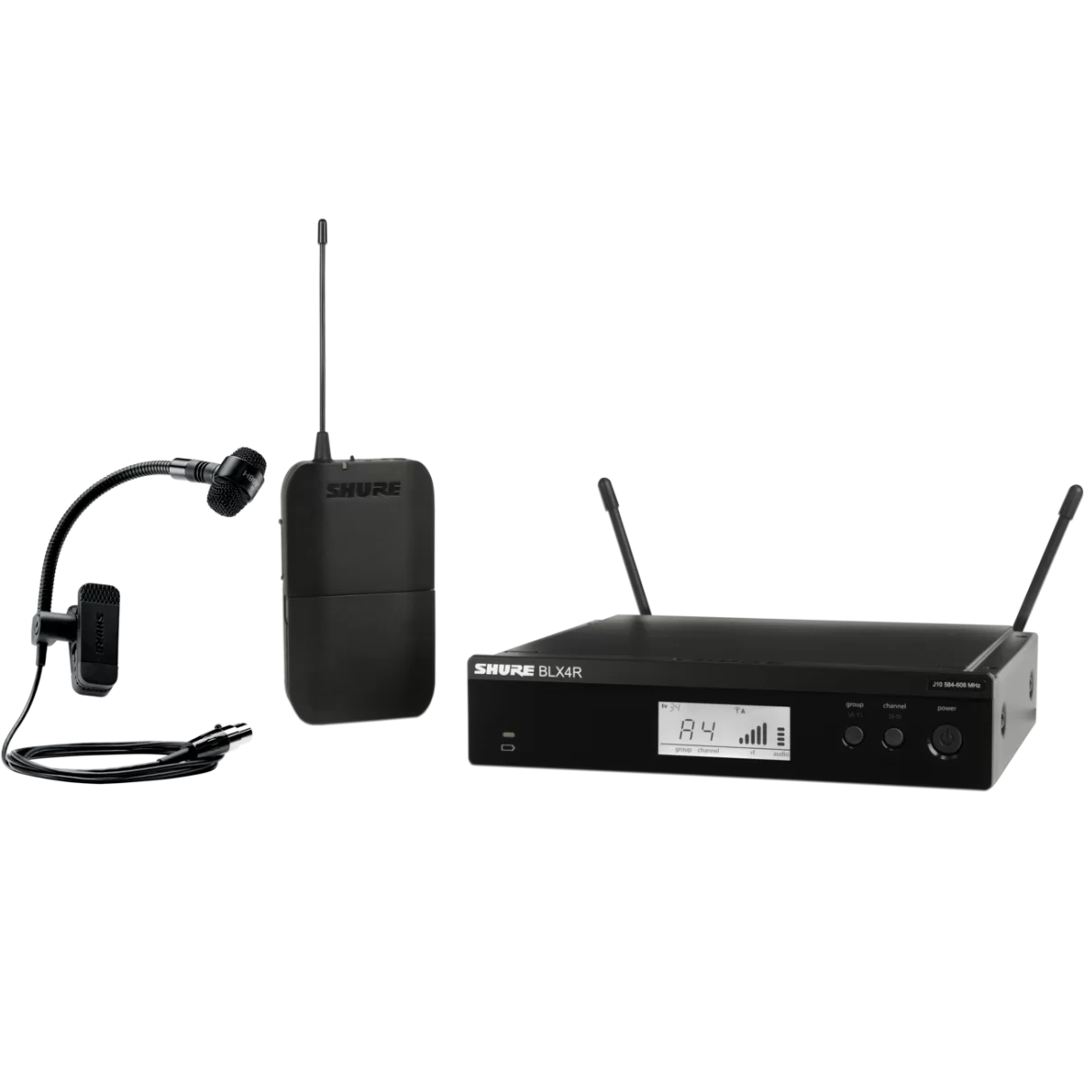 В систему входят: рэковый приемник BLX4R, компактный поясной передатчик BLX1 и конденсаторный инструментальный микрофон PGA98H-TQG. В комплекте поставляется блок питания, две батареи АА, две съемные антенны, набор для монтажа приемника в рэк, клипса для крепления микрофона и ветрозащита.