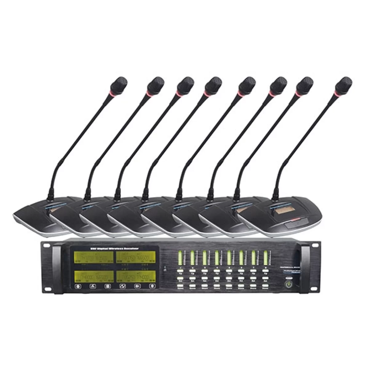 - 8 беспроводных микрофонов «гусиная шея». Единый приёмный модуль.