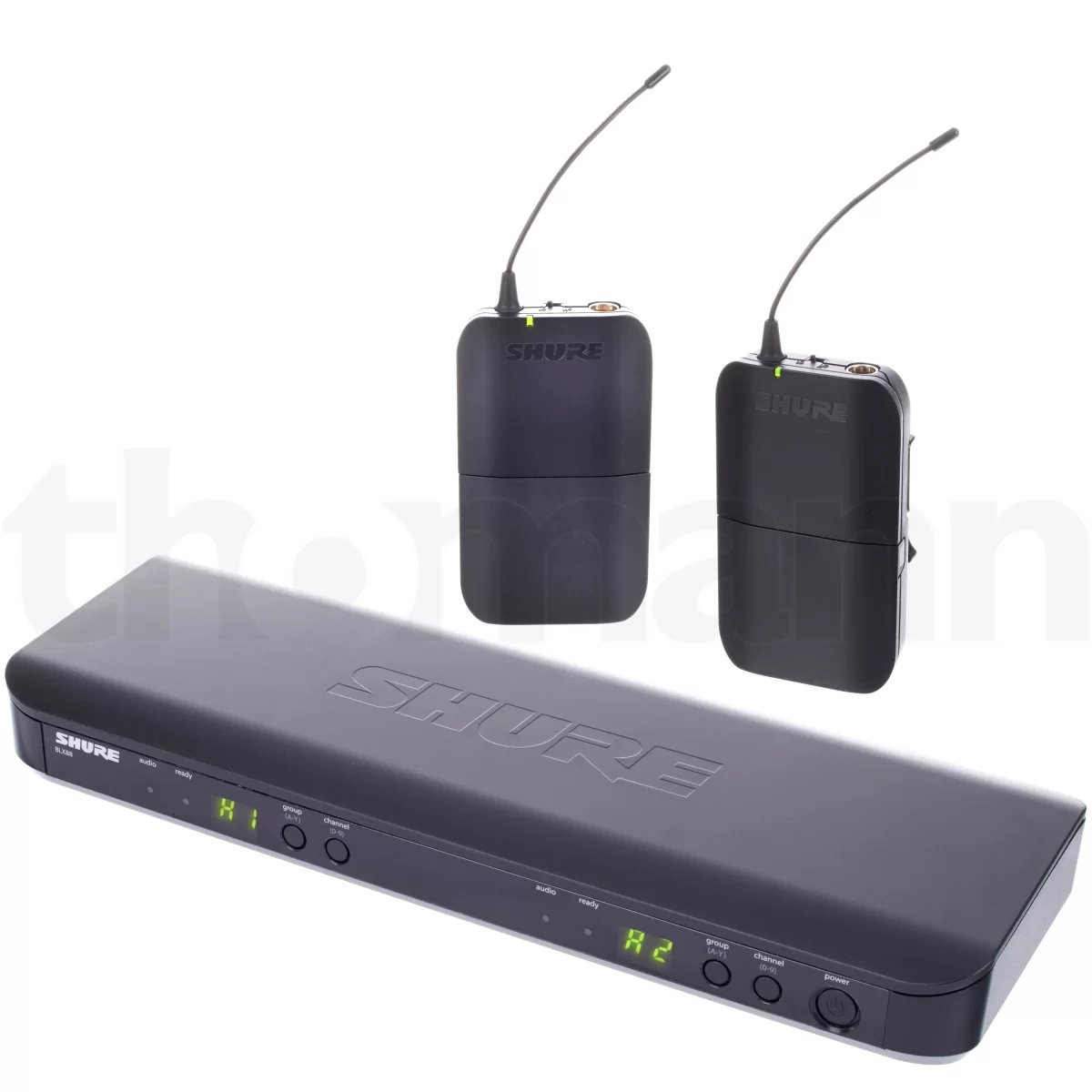 В систему входит двухканальный приемник BLX88 и два компактных поясных передатчика BLX1 для подключения различных видов микрофонов с помощью разъема TQG, а также гитар или других инструментов.