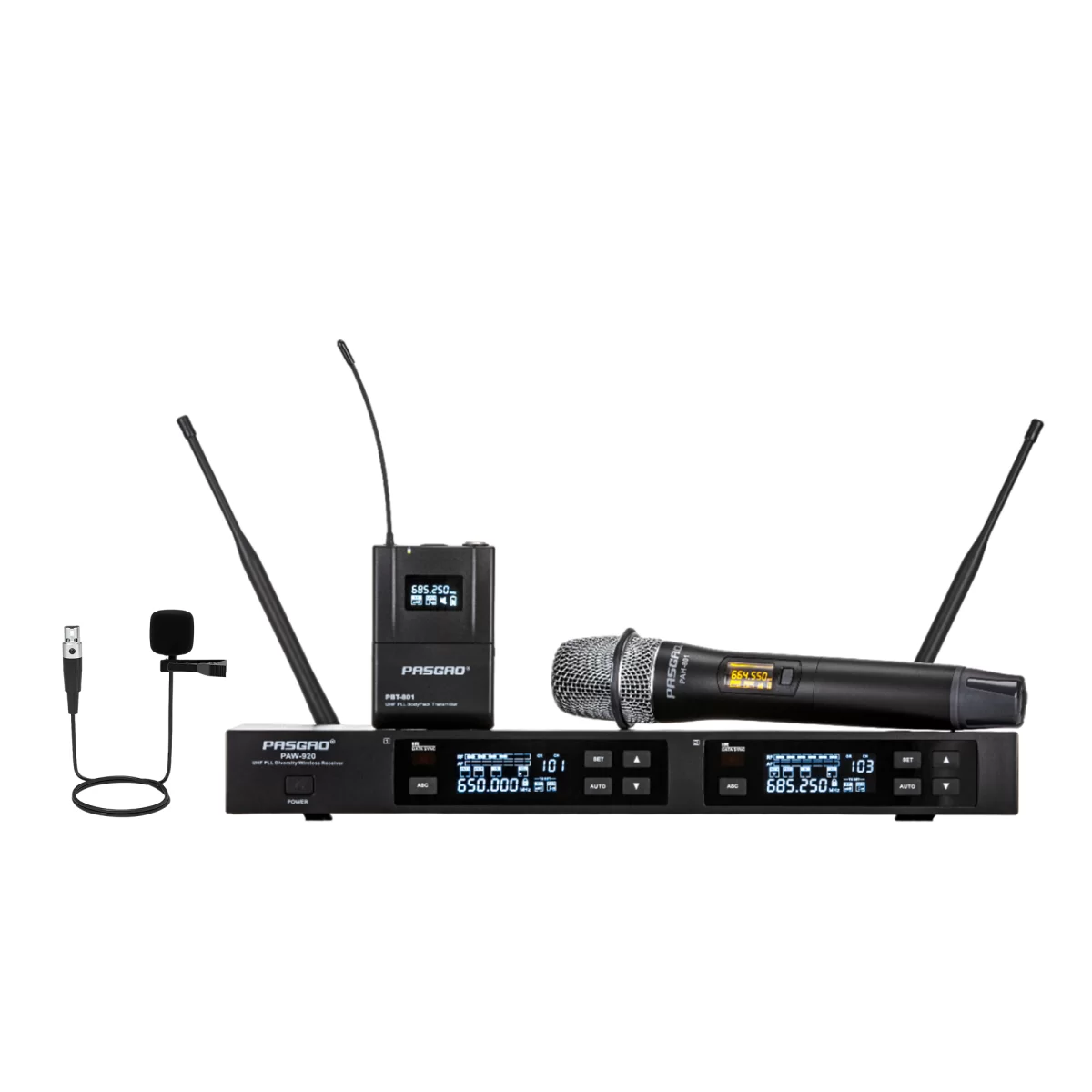 PasgaoPasgao PAW-920/PAH-801/PBT-801 - Радиосистема с петличным, ручным и поясным передатчиками