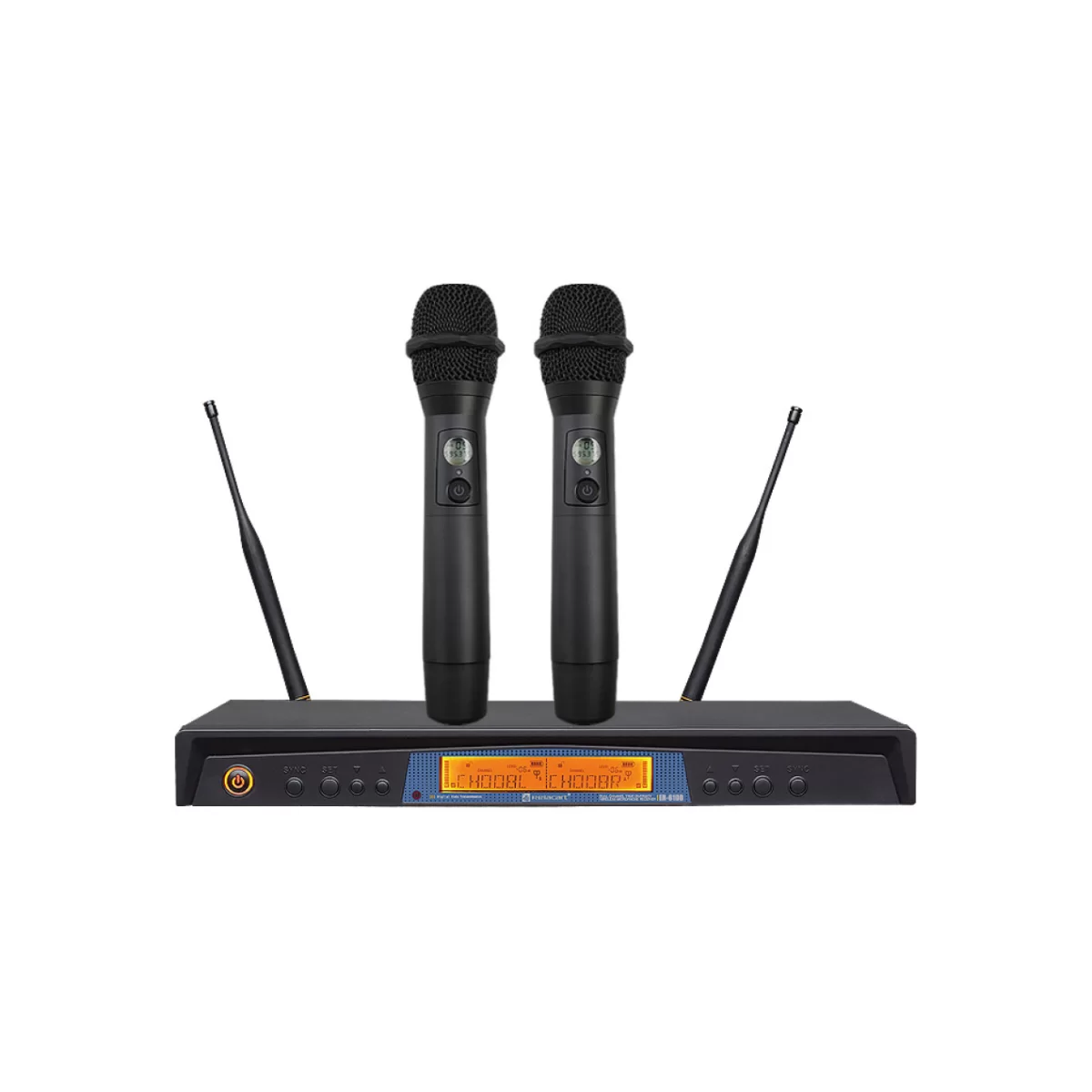 - Комплект вокальной радиосистемы из двухканальной базы ER6100 и двух ручных микрофонов EH-6100 с динамическими капсюлями