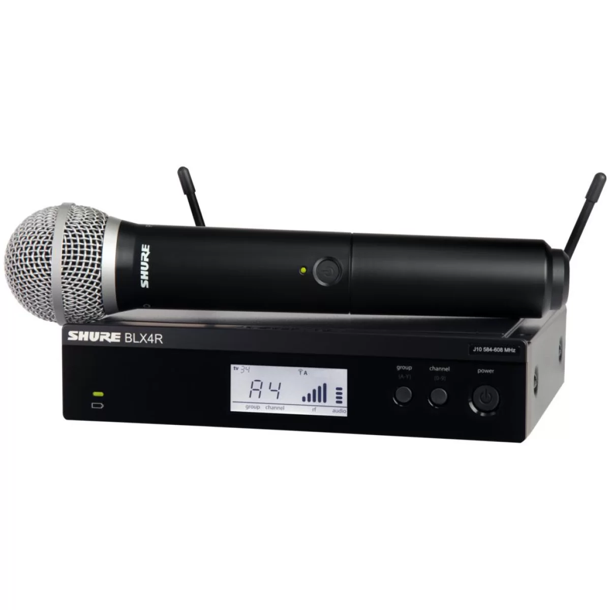Одноканальный приёмник BLX4R из комплекта Shure BLX24E/PG58 выполнен в полурэковом корпусе со всеми необходимыми отверстиями для винтов. Он обеспечивает кристально чистый звук. У приёмника усовершенствованная автоматическая настройка, интуитивно понятное управление, а внутренняя антенна управляется встроенным микропроцессором. Быстрое сканирование доступно с помощью всего одной кнопки, позволяя мгновенно выбрать свободную частоту с наилучшими параметрами. На корпусе расположены светодиодные индикаторы, показывающие наличие сигнала и клиппинг (превышение уровня). ЖК-дисплей отображает действительную рабочую частоту. Приёмник оснащен двумя выходами: на разъемах XLR и 1/4" TS Jack, а рабочий диапазон составляет 91 метр.
