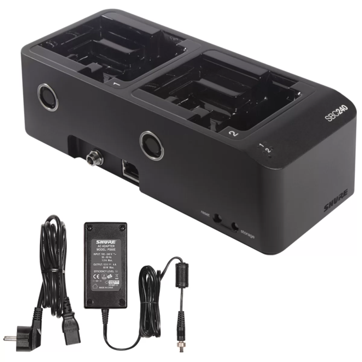 ShureShure SBC240-E - Двухпортовая сетевая зарядная док-станция позволяет заряжать аккумуляторы SB910 и SB920, а также передатчики ADX1, ADX2 и ADX2FD.