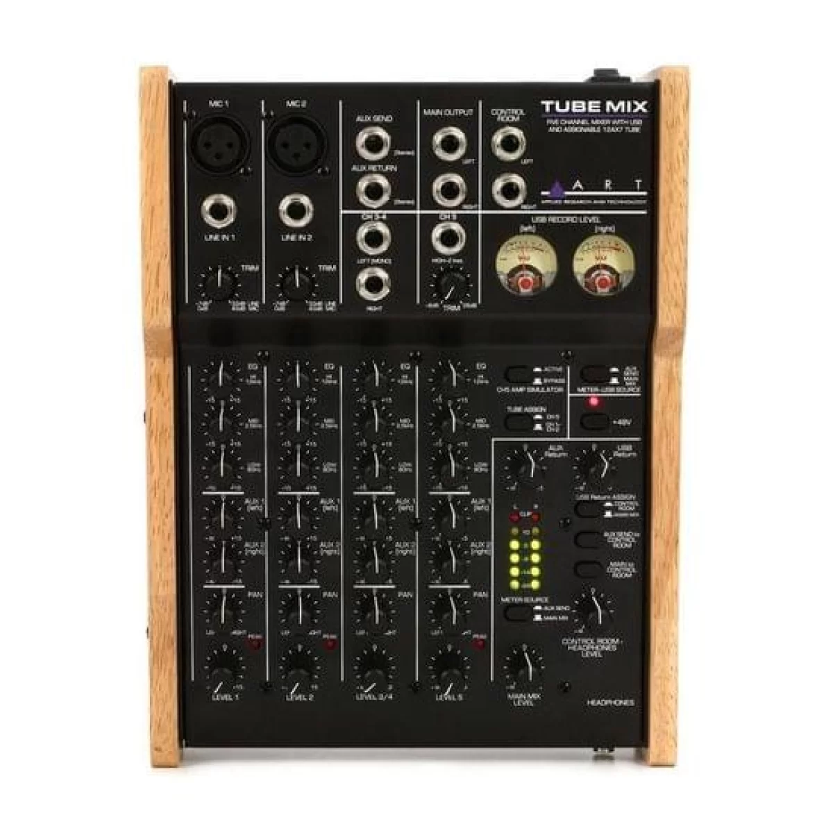 Выделенный высокоимпедансный инструментальный вход с имитацией усилителяВсе входные каналы оснащены 3-х полосным эквалайзером, регуляторами панорамирования и уровня, а также клип-индикаторы для оптимальной настройки уровня. Аутентичные стрелочные VU-метры и деревянные боковые панели придают TubeMix винтажный внешний вид.