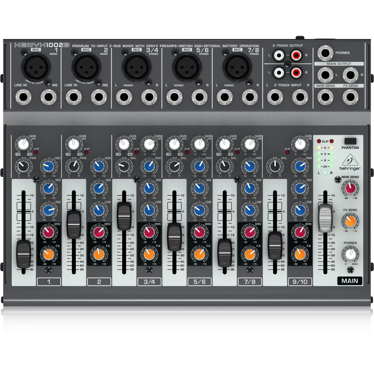 Behringer XENYX 1002B – Это малошумящий студийный 10-канальный аналоговый микшер с четырьмя микрофонными предусилителями XENYX, что позволяет использовать как динамические, так и конденсаторные микрофоны.