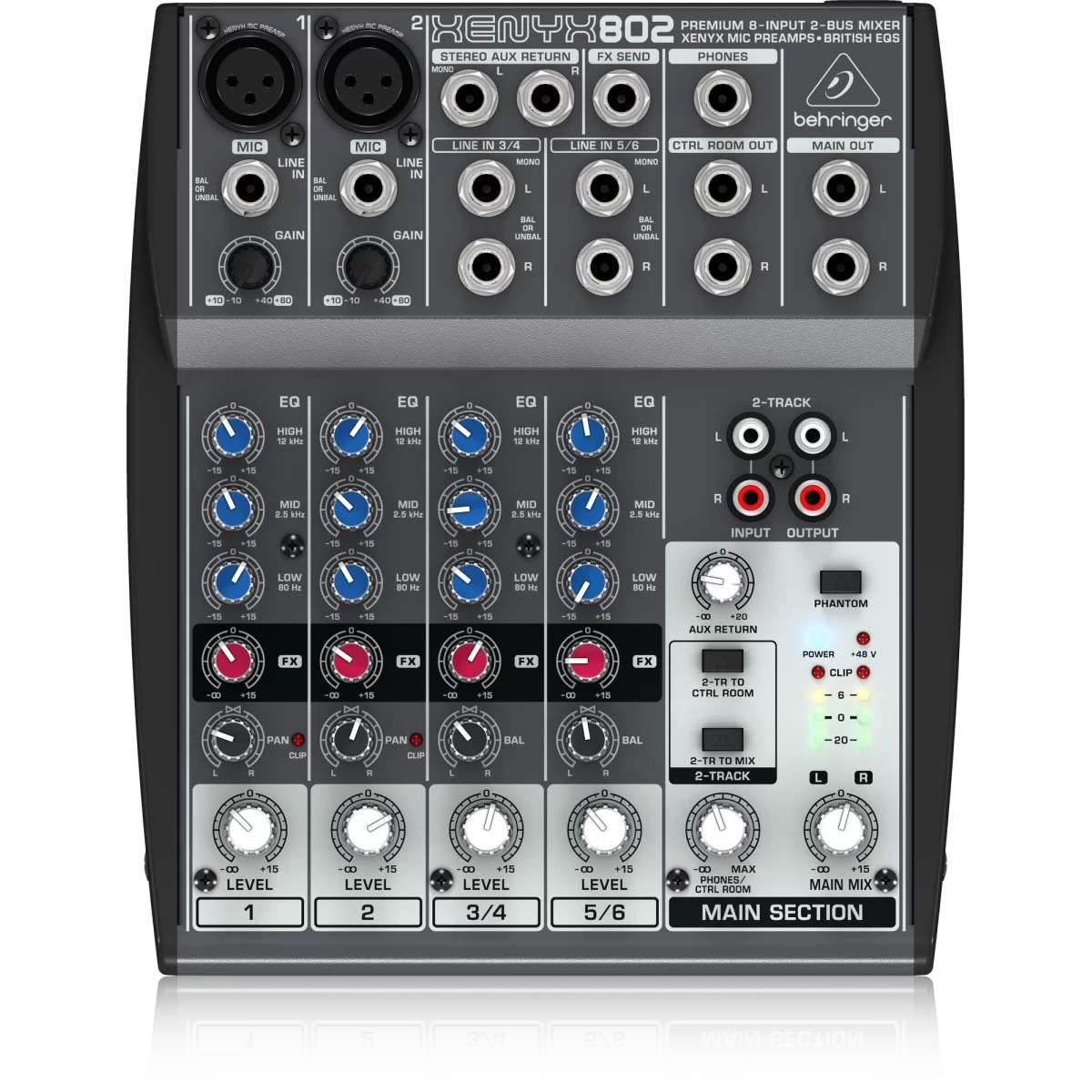 Behringer XENYX 802 – Это малошумящий студийный восьмиканальный аналоговый микшер с четырьмя микрофонными предусилителями XENYX, что позволяет использовать как динамические, так и конденсаторные микрофоны.