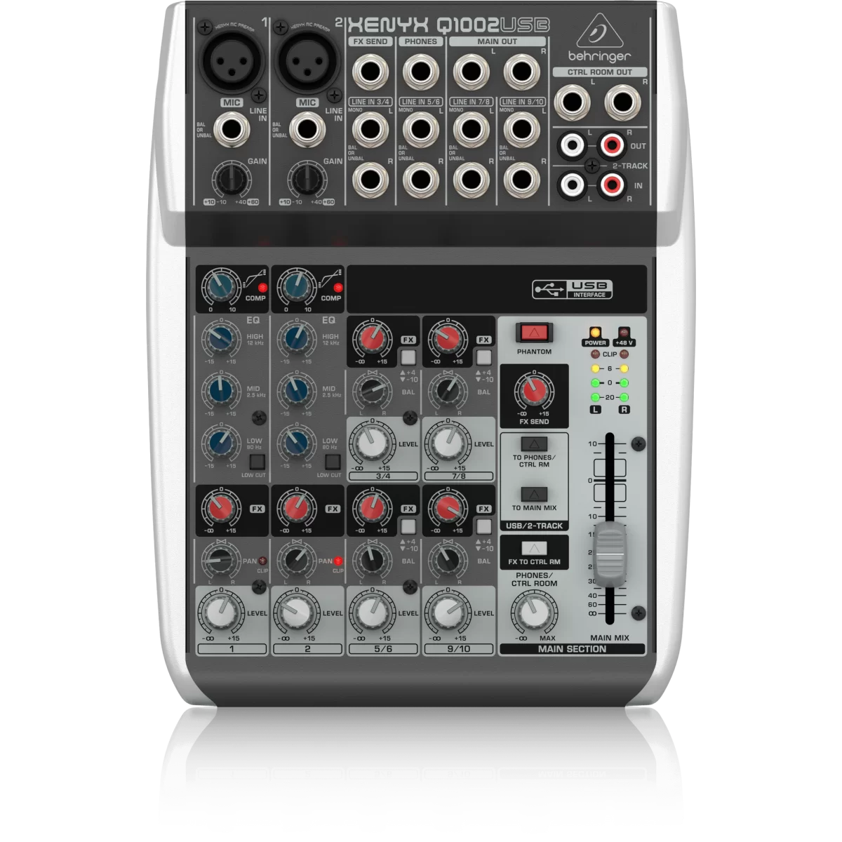 Behringer XENYX Q1002USB – Это малошумящий студийный 10-канальный аналоговый микшер с четырьмя малошумящими микрофонными предусилителями XENYX (динамический диапазон – 130 дБ), что позволяет использовать как динамические, так и конденсаторные микрофоны.