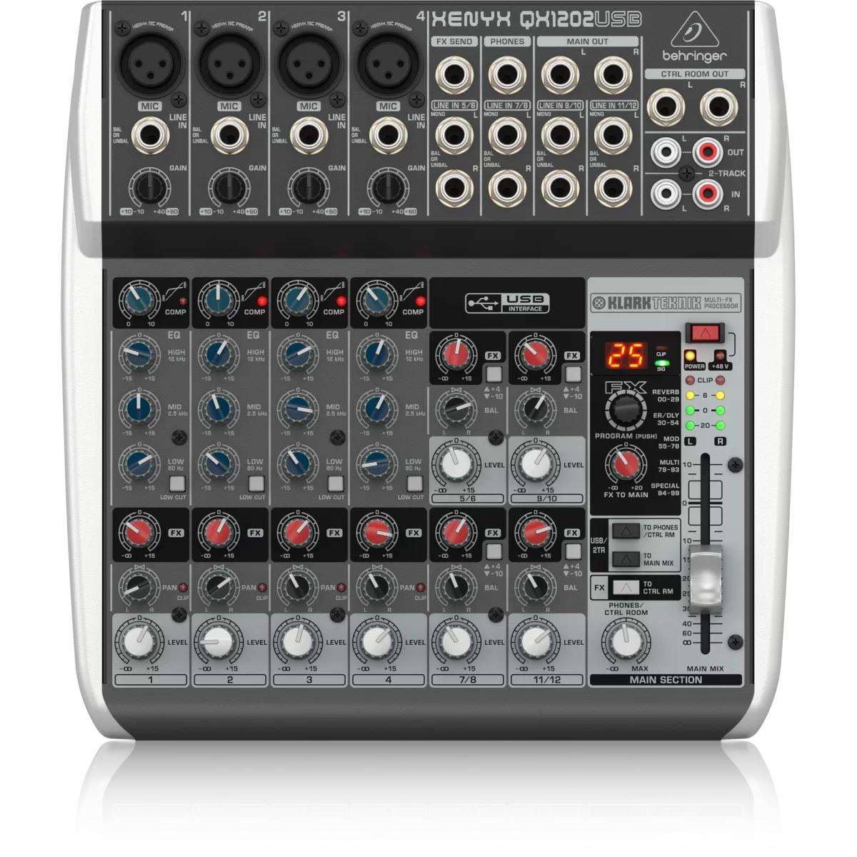 Behringer XENYX QX1202USB – Это малошумящий студийный 12-канальный аналоговый микшер с четырьмя микрофонными предусилителями XENYX, что позволяет использовать как динамические, так и конденсаторные микрофоны.