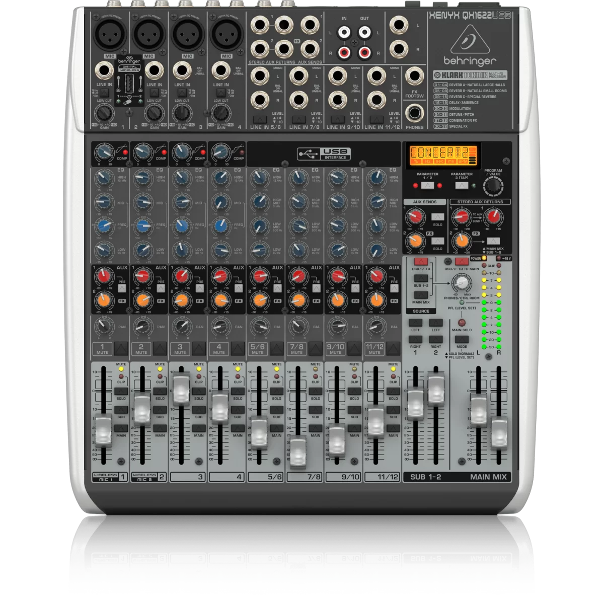 Behringer XENYX QX1622USB – Это профессиональный студийный 16-канальный аналоговый микшер с четырьмя микрофонными предусилителями XENYX.