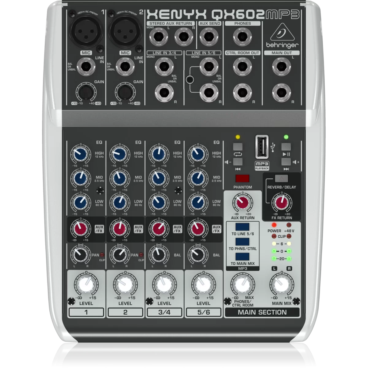 Behringer XENYX QX602MP3 – Это малошумящий студийный шестиканальный аналоговый микшер с двумя микрофонными предусилителями XENYX, что позволяет использовать как динамические, так и конденсаторные микрофоны.