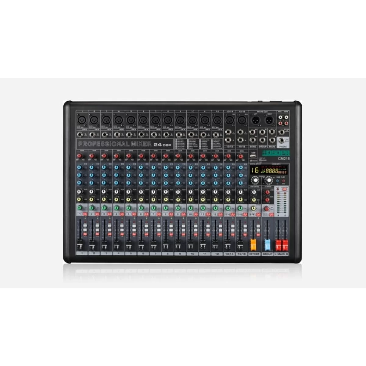Профессиональная микшерная консоль CM216 с 16 каналами — это высокопроизводительный микшер, разработанный для удовлетворения потребностей профессионалов в области аудио, музыкальных продюсеров и исполнителей. Опционально доступны 12-канальные монофонические входы XLR и 2-канальные стереофонические входы. Серия устройств оснащена фантомным питанием 48 В, процессором DSP-эффектов с 24 каналами, функцией записи через USB и светодиодным экраном состояния. Они обеспечивают точность благодаря 3-полосному эквалайзеру, переключателям отключения звука и PFL на каждом канале, что позволяет достичь нового уровня микширования звука, обеспечивая превосходное качество звука и гибкое управление.