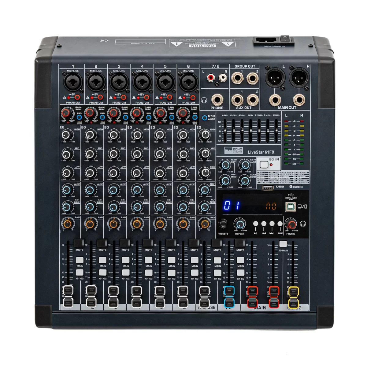 Цифровой блок LiveStar 61FX состоит из процессора на 24 эффекта (Hall, Room, Reverb, Phaser, Chorus и прочие), USB-плеера с панелью транспорта, блока Bluetooth для беспроводного воспроизведения фонограмм и USB-аудиоинтерфейса 2х2.