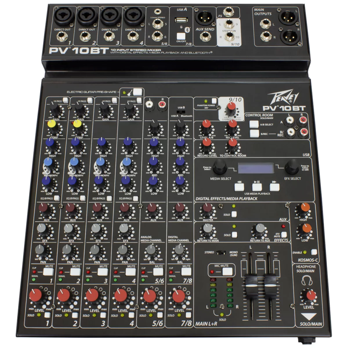 PeaveyPeavey PV 10 BT - Имеет 4 комбинированных входа XLR/Jack, 4 прямых выхода для звукозаписи, стереоканал, медиаканал по беспроводному подключению Bluetooth, высококачественные встроенные звуковые эффекты, выход USB, функцию воспроизведения MP3-файлов через USB-A.