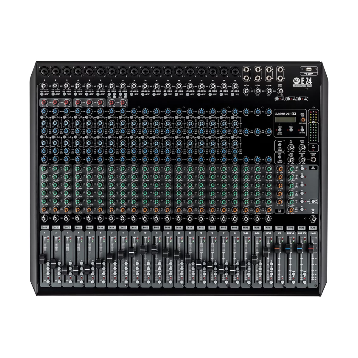 Профессиональный аналоговый микшерный пульт RCF E 24 от итальянской компании RCF. Это усилитель с 24 каналами, в числе которых 18 моно каналов с четырехполосным эквалайзером и три стерео канала с трехполосным эквалайзером. Два входа способны переключаться в режим Hi-Z для приема сигнала от источника с высоким импедансом (до 1 МОм), например, от электрогитар. Пульт работает в частотном диапазоне от 20 Гц до 20000 Гц. Микшер оснащен двадцатью пятью 100 мм фейдерами, светодиодной индикацией уровня сигнала и кнопками мьютировавния для каждого канала.