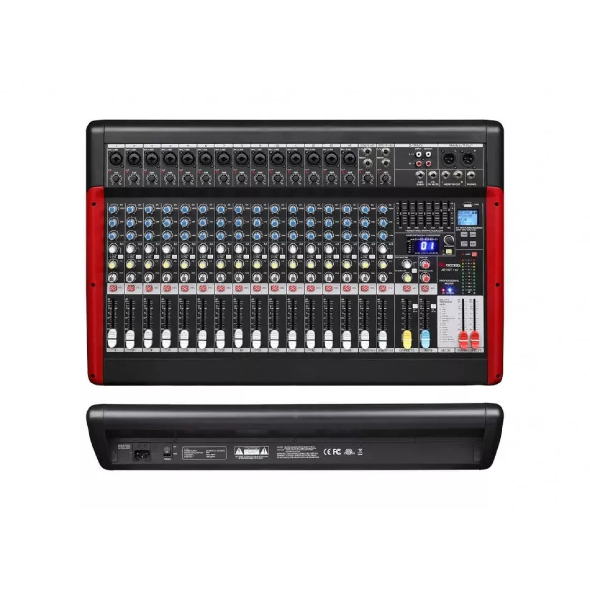 - Входы: 14xMIC/LINE CH1-14 (XLR/Jack 1/4"), 2xST LINE CH15/16-17/18 (2xJack 1/4"), 2-TRACK (2xRCA), USB A