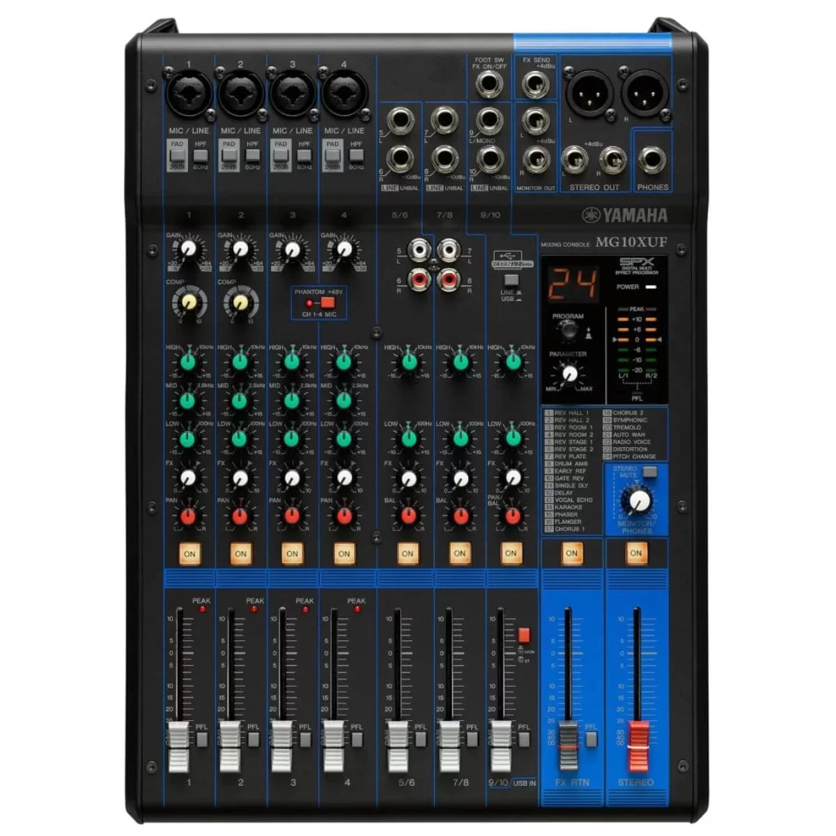 Yamaha MG10XUF имеет 4 линейных/микрофонных входов XLR/TRS 1/4’’ Jack с функциями понижения входной громкости на 26 дБ и фильтром низких частот до 80 Гц. Каналы оборудованы микрофонными предусилителями, трёхполосным эквалайзером с усилением/ослаблением выбранной частоты на 15 дБ и отключаемым фантомным питанием, что позволяет использовать разные типы микрофонов.