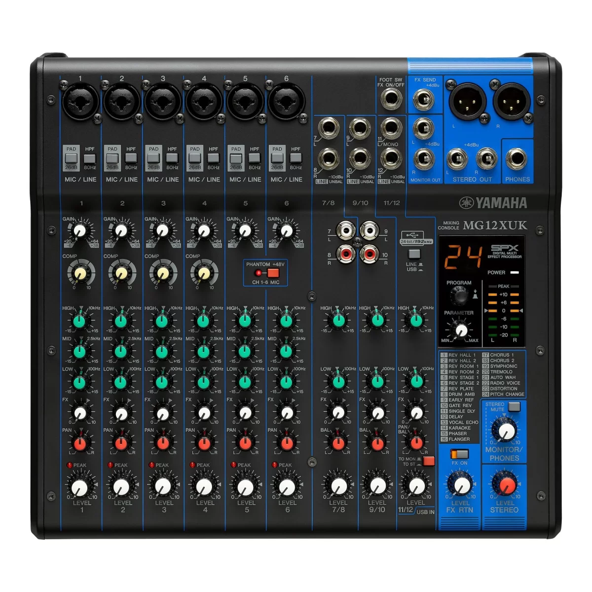 Yamaha MG12XUK имеет 6 линейных/микрофонных входов XLR/TRS 1/4’’ Jack с функциями понижения входной громкости на 26 дБ, фильтра низких частот до 80 гЦ. Каналы оборудованы микрофонными предусилителями, трёхполосным эквалайзером с усилением/ослаблением выбранной частоты на 15 дБ и отключаемым фантомным питанием, что позволяет использовать разные типы микрофонов.