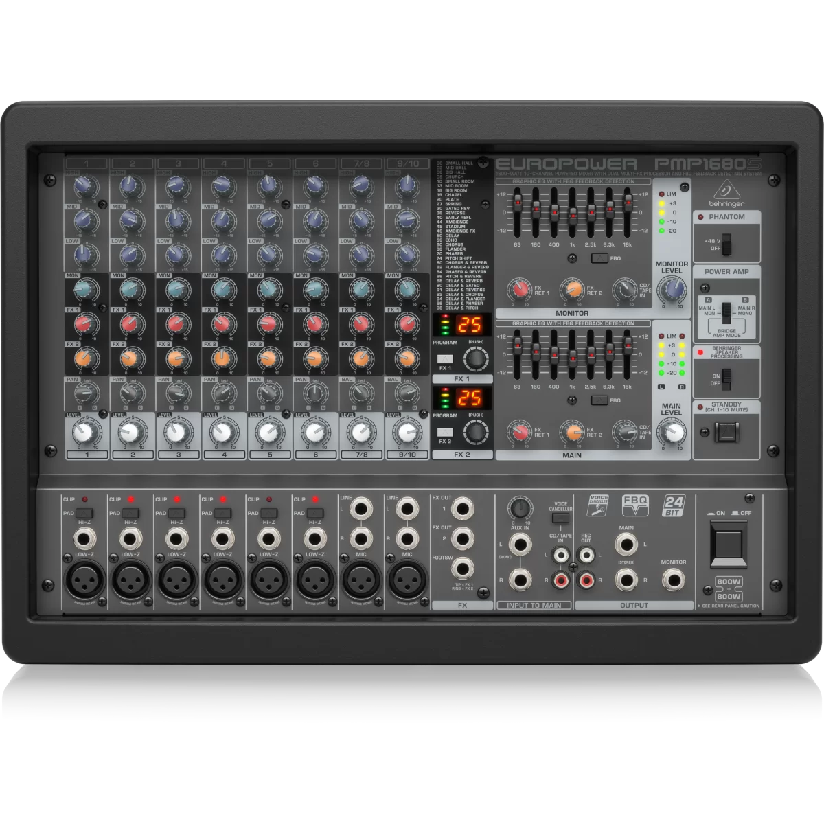 Behringer PMP1680S - Рэковый микшерный пульт со встроенным усилителем и системой обнаружения обратной связи FBQ.