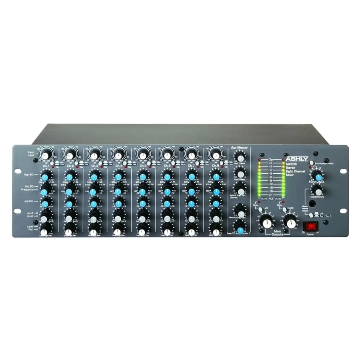 Ashly MX-508 – Это восьмиканальный рэковый микшер типоразмера 3U с восемью микрофонными XLR-входами, восемью линейными входами и стереовыходами. Встроены малошумящие микрофонные предусилители. На каждом из восьми каналов есть переключаемый аттенюатор -20 дБ, трехпозиционный переключатель гейна, а также ручки регулировки уровня сигнала и паннинга.