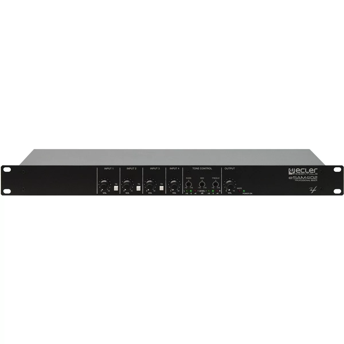EclerEcler eSAM402 – Четырехканальный коммутатор/микшер с тремя входами балансного микрофонного / линейного сигнала с фантомным питанием 18 В, одним небалансным стереовходом, с эквализацией.