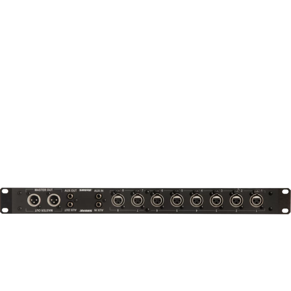 SHURE RKC800 занимает единое пространство в стойке для оборудования при стандартной длина корпуса в 483 мм (19 дюймов). Его передняя панель содержит восемь фиксирующих входных разъемов универсального и распространенного стандарта XLR, два выходных разъема XLR и две пары позолоченных стереоразъема AUX IN и AUX OUT.