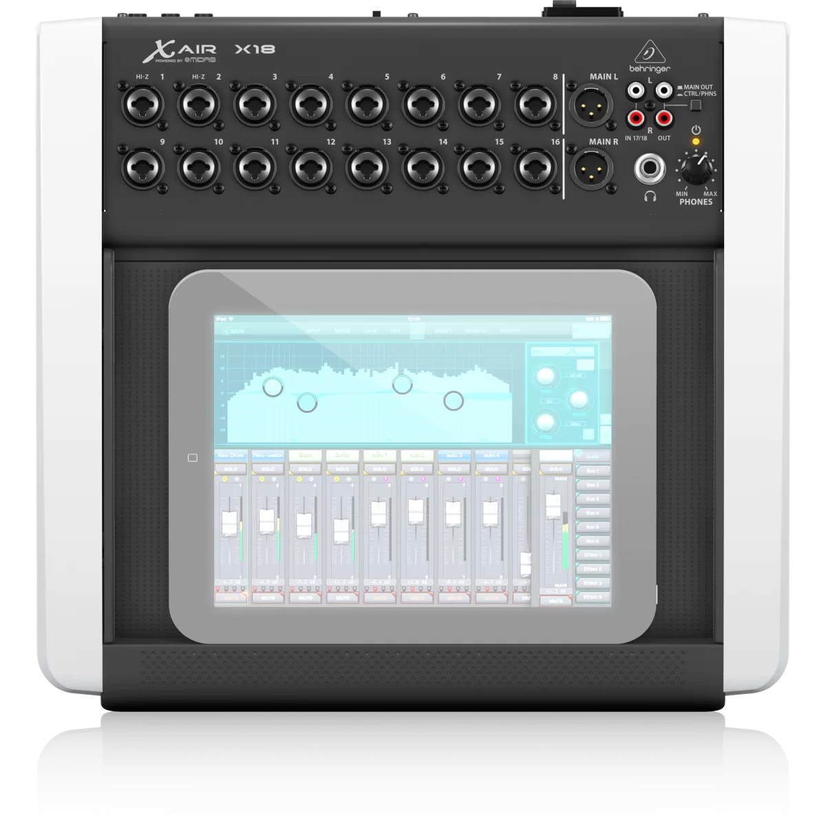 BEHRINGER X18 - 18-канальный, 12-bus цифровой микшерный пульт для для iPad и других планшетов, который отлично подойдет для живых концертов и работы в студии, благодаря наличию 16 отмеченных наградой полностью программируемых микрофонных предусилителей MIDAS, удобному интегрированному модулю Wi-Fi для беспроводного контроля и USB-интерфейсу, работающему со скоростью молнии.