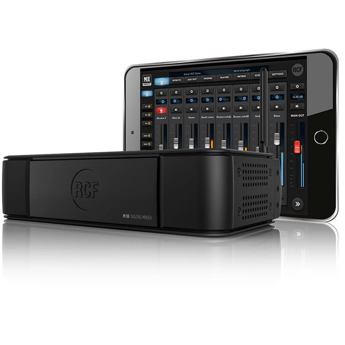 Поэтому RCF M 18 разительно отличается от традиционных микшеров. Здесь нет привычных аппаратных фейдеров и микшер выполнен в виде миниатюрного стейджбокса, который может быть установлен прямо на сцене. Абсолютно всё управление осуществляется дистанционно с экрана планшета и может выполняться самими музыкантами. Примечательно и то, что к микшеру можно подключать одновременно несколько планшетов, с помощью которых музыканты могут индивидуально регулировать всевозможные параметры.