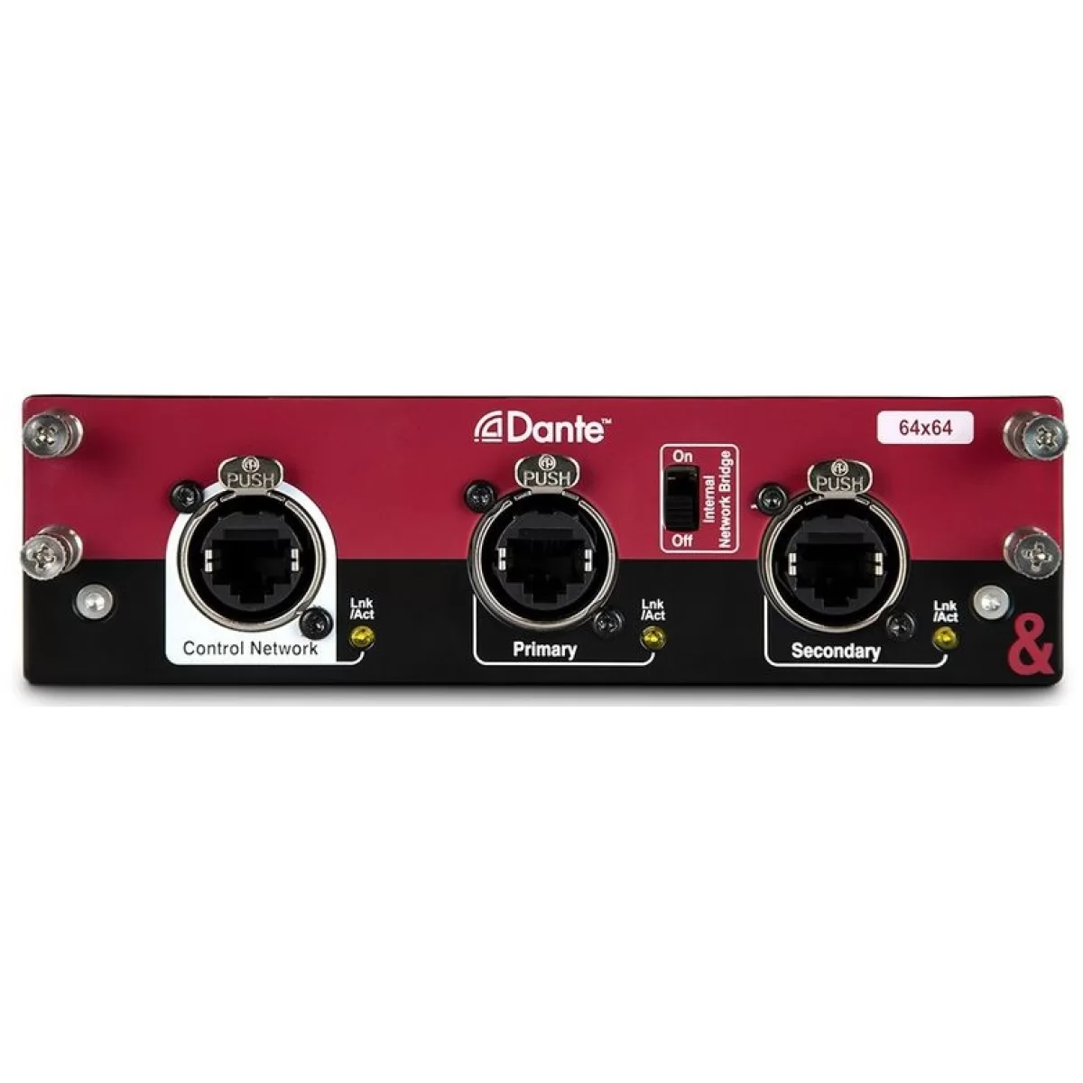 Разработана для использования dLive при проведении прямых эфиров, трансляций и вещания. Обеспечивает низкую задержку и возможность подключения с большим количеством каналов к сетям и устройствам Dante с использованием стандартных сетевых кабелей и оборудования. Благодаря 64-канальному двунаправленному звуку на частоте 96 кГц карта Dante 64 × 64 подходит для разделения цифровых каналов между системами, например FOH и MON, с одновременной многодорожечной записью через виртуальную звуковую карту Dante (приобретается отдельно). Первичный и вторичный порты на передней панели позволяют одновременно подключаться к нескольким устройствам Dante или дублировать два кабеля с совместимым оборудованием. Выделенный порт сети управления предоставляется для настройки с использованием программного обеспечения Dante Controller. Поддержка стандарта AES67 обеспечивает совместимость с другими протоколами AoIP, имеющимися в сценариях трансляции, установки и живого звука, и упрощает передачу звука между различными системами. Совместимость с Dante Domain Manager (DDM) обеспечивает интеграцию с большими сетями и прозрачную маршрутизацию через подсети, а также надежные параметры безопасности и аутентификации.
