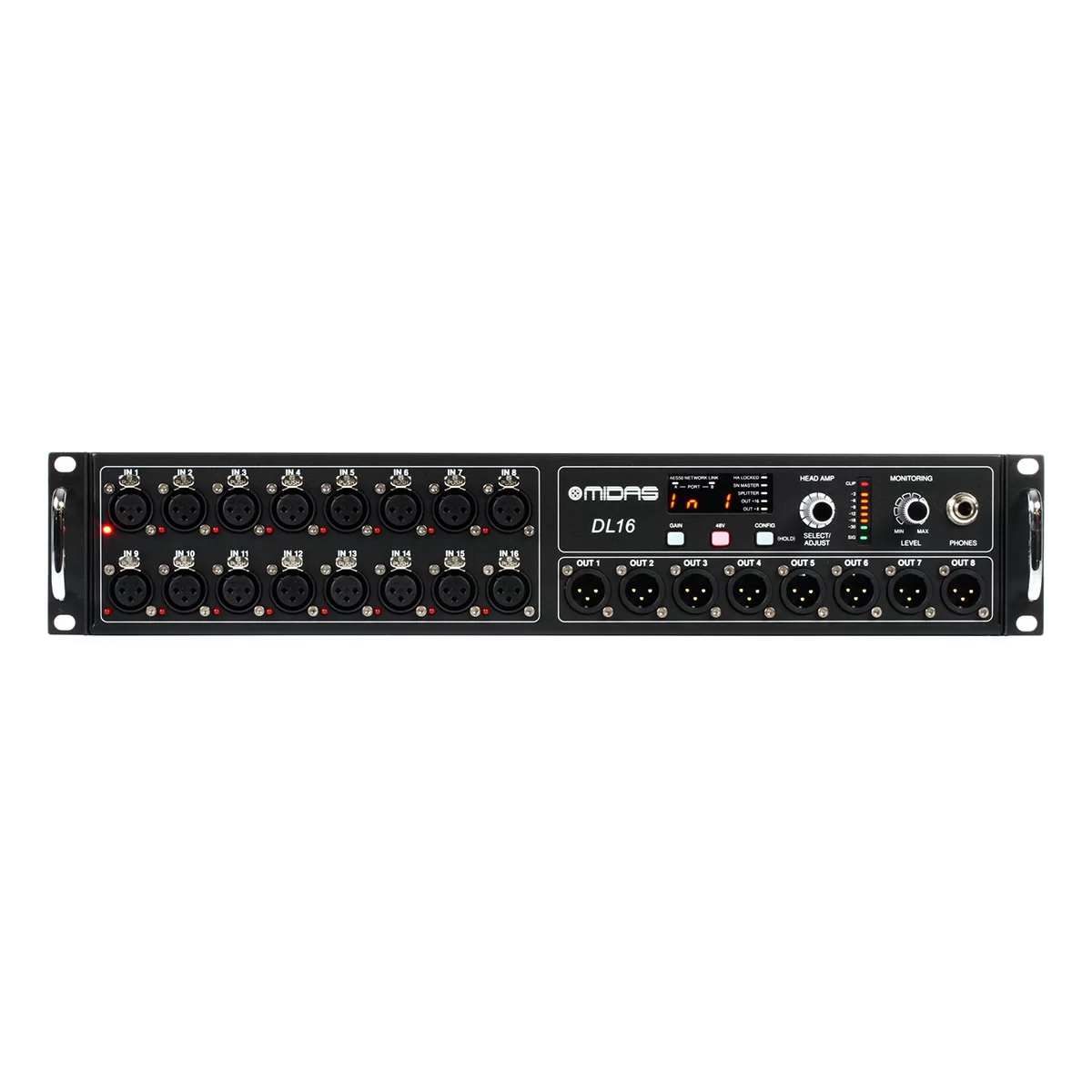 MidasMIDAS DL16 - коммутационный блок (стейдж-бокс) для работы с микшерными консолями, включающий в себя микрофонные предусилители (16 штук), порт Ultranet для подключения Powerplay P16 и другие функциональные возможности оборудования профессиональной серии.