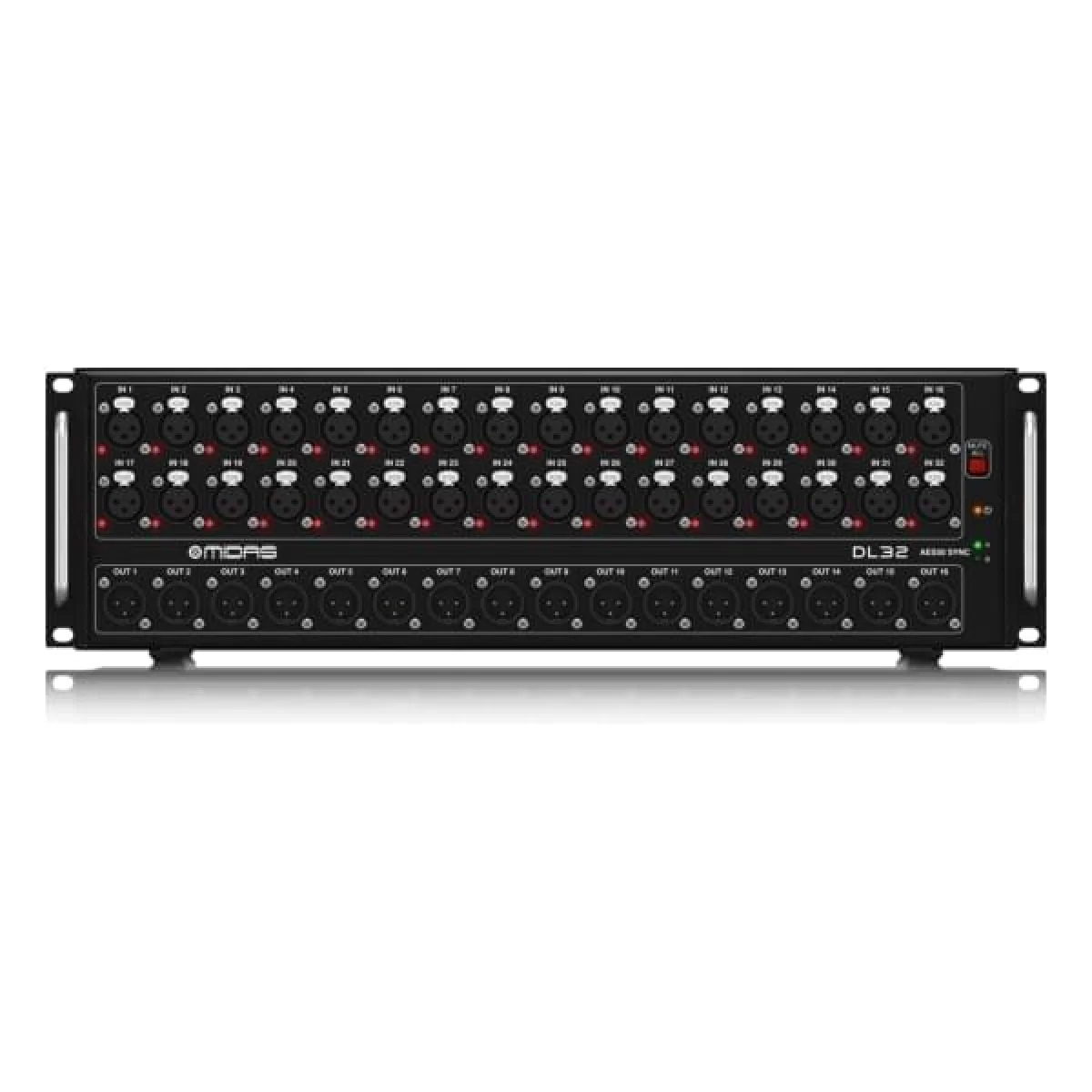 Midas DL32 – Это стейдж-бокс для микшерной консоли Midas M32 с 32 входами и 16 выходами в рэковом форм-факторе, высота – 3U.