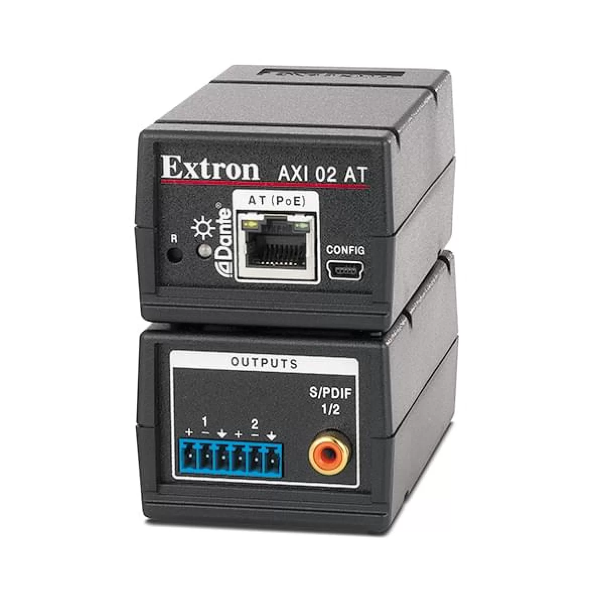 Extron AXI 02 AT – это компактный интерфейс аудио, который извлекает два канала из аудиосети Dante®. Этот аудиоинтерфейс Dante выводит два аудиоканала от сети на устройства без сетевого подключения Dante. Он имеет два аналоговых выхода линейного уровня на разъёмах под зажим и один дублирующий двухканальный выход S/PDIF на коаксиальном разъёме RCA. AXI 02 AT взаимодействует с аудиосетью Dante в рамках стандартной локальной сети и получает питание через функцию PoE. В комплект AXI 02 AT входит монтажный набор ZipClip® 100, и он совместим с рэковыми полками и монтажными решениями ZipClip 200 от Extron.