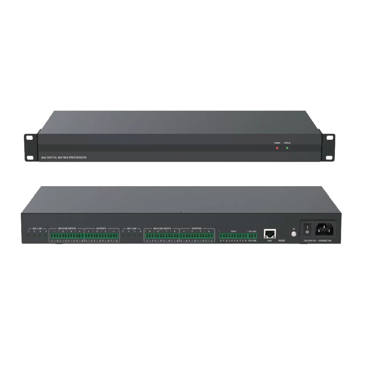 Описание подготовлено командой сайта samid.ruЦифровой аудиопроцессор, оснащенный 8-канальными микрофонными/линейными входами и 8-канальными линейными выходами, может обрабатывать аудиосигналы с помощью таких алгоритмов, как полнодиапазонное адаптивное эхоподавление (AEC), адаптивное шумоподавление (ANS), автоматическая регулировка усиления (AGC) и автоматический микшер, для вывода чистого звука с высоким отношением сигнал/шум.