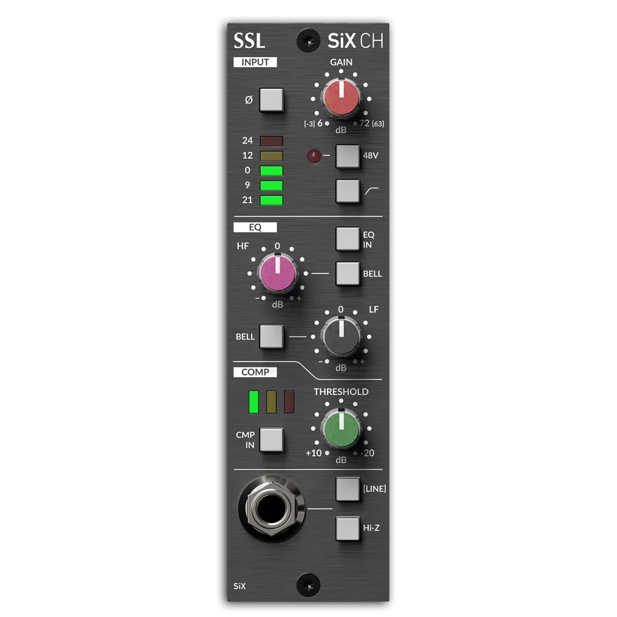 Шестиканальный стрип (SiX CH) - это одноканальный стрип серии 500, использующий функции обработки каналов SuperAnalogueTM на консоли SSL SiX, включая микрофонную установку, эквалайзер низких и высоких частот, а также компрессор с одной ручкой.