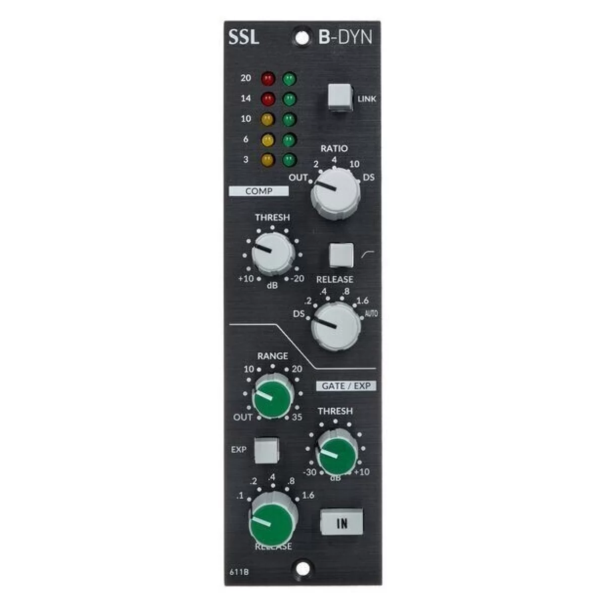 Модуль воспроизводит легендарные звуковые характеристики динамической обработки канальной линейки классической консоли SSL 4000E, созданной в ранних 80-х. Модуль имеет секцию компрессора/лимитера и секцию экспандера/гейта, каждая из которых построена на оригинальных ключевых элементах, которые определили звучание оригинальной канальной линейки SL 611E Series. В цепи сайд-чейн используется настоящий RMS конвертор, в то время как элемент усилителя построен на полностью дискретной схемотехнике, идентичной оригинальному Class A VCA чипу, использованному в оригинальной консоли. Компрессор имеет ряд дополнительных переключаемых опций, например изменение кривой компрессии, а также возможность использования линейной характеристики затухания вместо более традиционной логарифмической кривой. В итоге вы получаете компрессор с тремя различными характеристиками, каждая из которых имеет свой музыкальный характер.