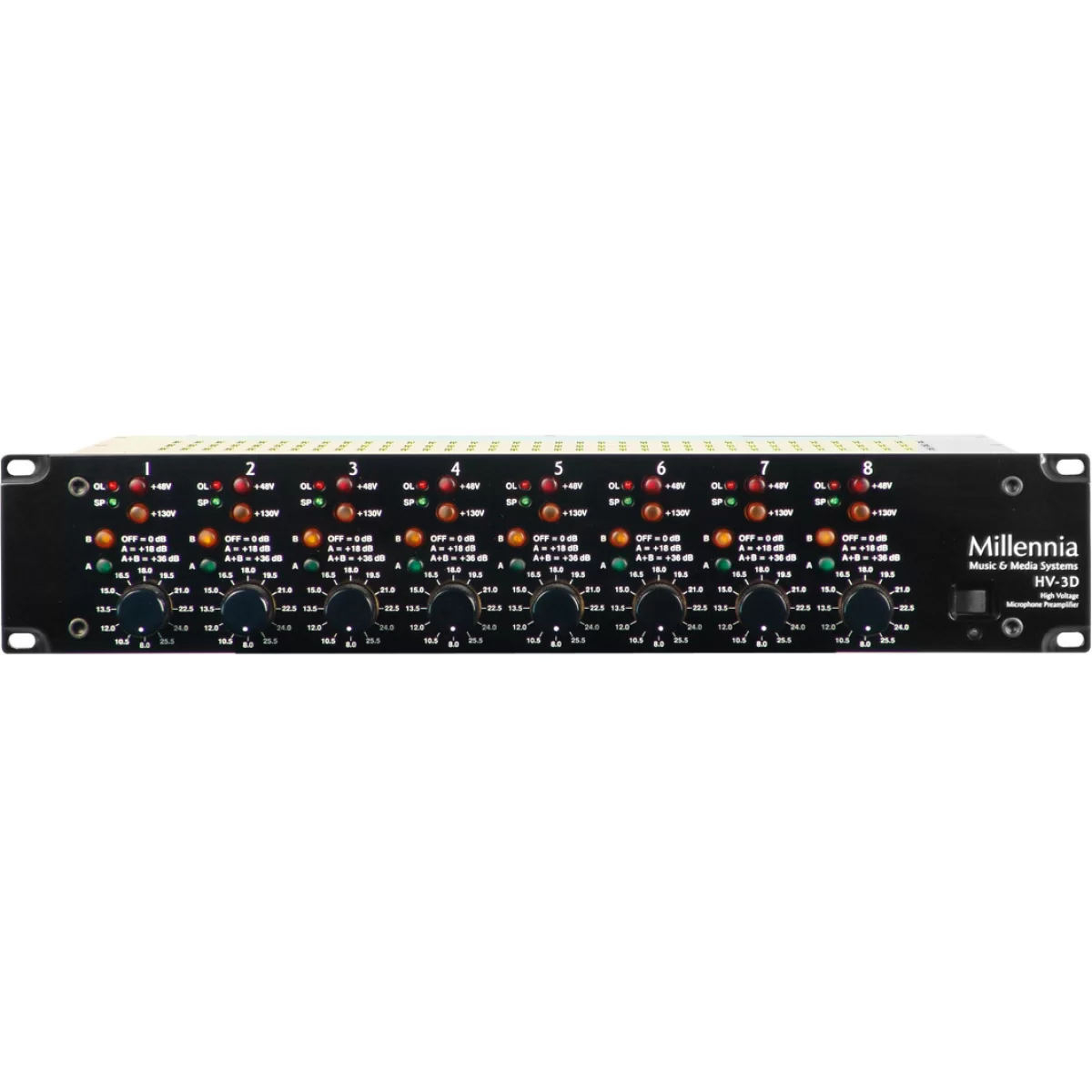 Millennia MediaMillennia Media HV-3D-8 - Двухрэковый микрофонный предусилитель, является восьмиканальным вариантом HV 3 B, от которого отличается уже установленными 36-шаговыми регуляторами чувствительности.