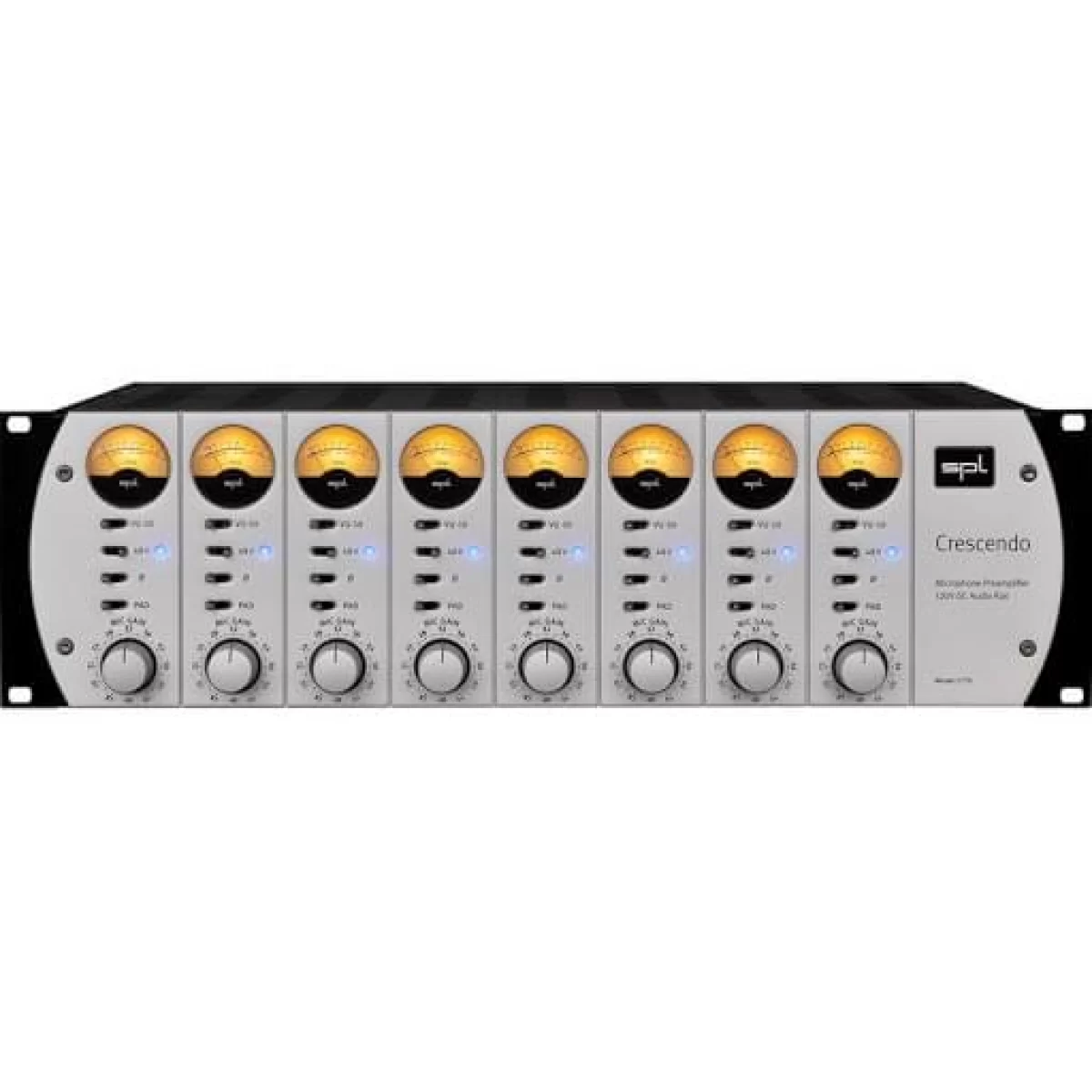SPL Crescendo располагает 8 независимыми секциями с предусилителями A класса и индивидуальными параметрами. Каждый канал имеет настройки усиления, изменения фазы, режим pad (-20 дБ) для уменьшения уровня сигнала и переключатели фантомного питания. Усиление для каждого из каналов устройства составляет от 18 до 70 дБ.