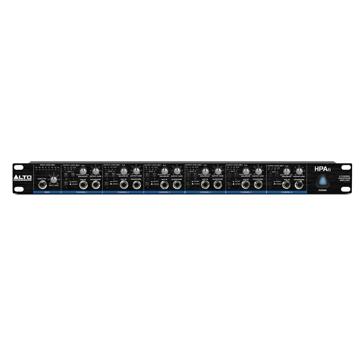 Alto HPA6 имеет шесть отдельных каналов для наушников и позволяет создавать микс для шести музыкантов. Каждый канал оборудован тремя выходами на наушники, что дает возможность подключения в совокупности 18 наушников. Три запараллеленных выхода для наушников - TRS jack, один из которых располагается для удобства на передней панели усилителя.
