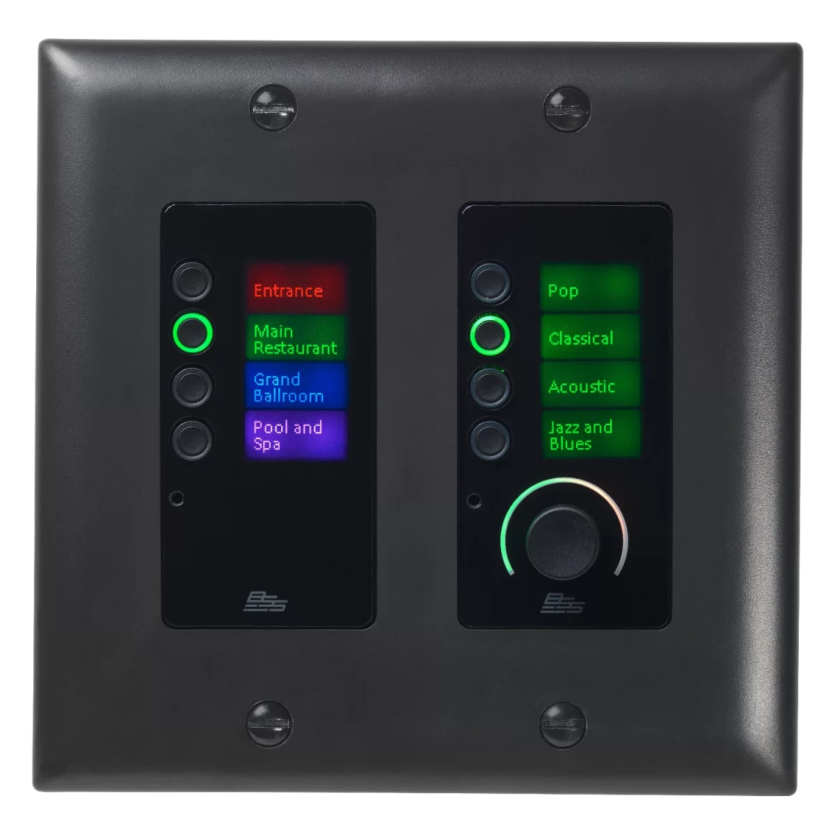Модель BSS EC-8BV состоит из 2 секций, каждая из которых оснащена четырьмя кнопками и жидкокристаллическим дисплеем 64x128 пикселей с подсветкой разного цвета. Одна из секций дополнительно оборудована круглым регулятором с возможностью нажатия. Предусмотрено 8 цветов подсветки с настраиваемой яркостью, на дисплее может отображаться необходимый текст. В режиме «сна» панель будет выключаться через заданный промежуток времени, в течение которого она не использовалась, подсветка при этом выключится. При любом воздействии пользователя она снова автоматически включится.