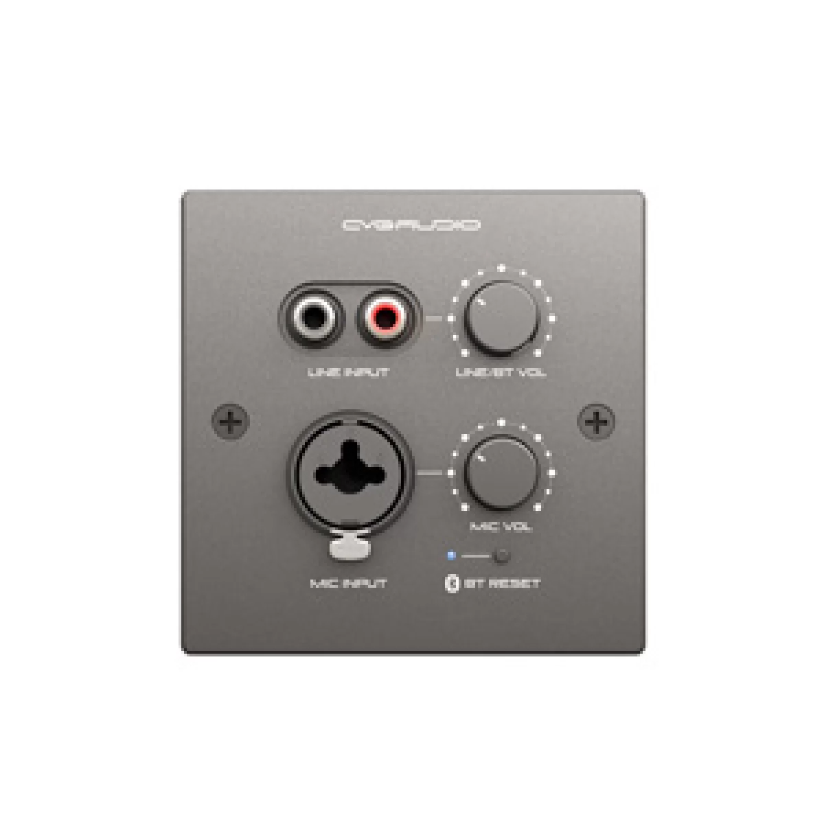 Панель оснащена двумя входами на лицевой части: линейный, небалансный, разъем 2RCA и микрофонный, балансный, универсальный разъем XLR/TRS. Входы дублируются коннекторами 2х EuroBlock 3-pin, которые расположены на задней части устройства с целью скрытого подключения в случае необходимости. Предусмотрен еще один способ подключения источника, а именно, беспроводной, за счет встроенного модуля Bluetooth (версия 5.1, антенна-стикер, дальность до 10м при прямой видимости). При его использовании источником становится любой мобильный гаджет. Аудиовыходы для передачи суммарного балансного моно или стерео-сигнала. Для управления громкостью есть два независимых регулятора.